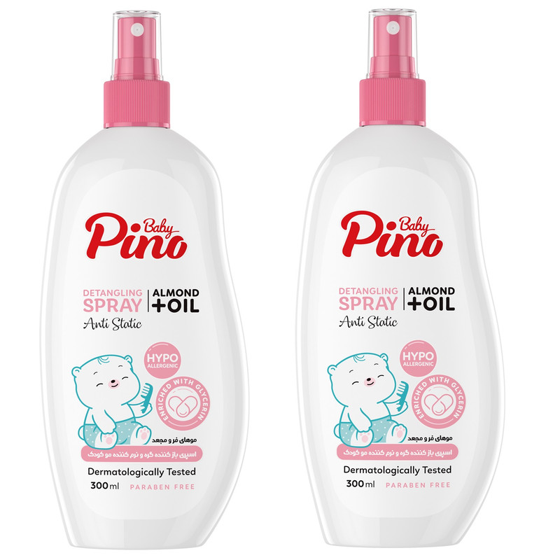 اسپری باز کننده گره و نرم کننده مو کودک پینو بیبی مدل مناسب موی فر و مجعد غنیشده با روغن بادام و گلیسیرین حجم 300 میلی لیتر مجموعه 2 عددی