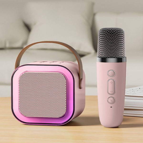 اسپیکر و میکروفن بلوتوثس مدل karaoke با ابعاد اسپیکر 9x8x6 و ابعاد میکروفن 4x13 سانتی متر، دارای سه حالت رقص نور میباشد و قابلیت شارژ کردن دارد همچنین میکروفن ابلیت 5 حالت تغییر صدا دارد و با فشار دادن دکمه میکروفن روی اسپیکر صدای خوانند جذف می شود و خودتان بخ جای خواننده میتوانید بخوانید. توان خروجی 5 وات میباشد و دارای پورتهای USB، AUX و کارت حافظه میباشد.