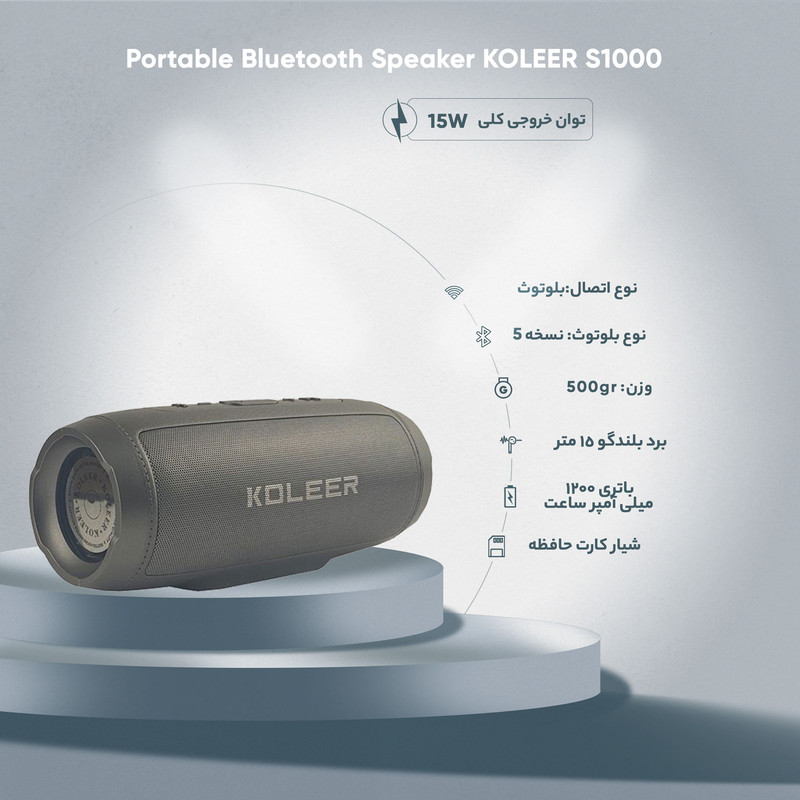 «اسپیکر بلوتوثی قابل حمل کُلِر» مدل (S1000) دارای صدای با کیفیت و توان خروجی 5 وات است. این اسپیکر قادر است تا مسافت 15 متر را پشتیبانی کند و صدایی شفاف و باکیفیت را ارائه دهد. انرژی مورد نیاز این محصول از طریق باتری داخلی قابل شارژ آن تامین میشود. این باتری دارای ظرفیت 1200 میلیآمپرساعت است. «اسپیکر بلوتوثی قابل حمل کُلِر» مدل (S1000) از رادیو، فلش و کارت TF پشتیبانی میکند و پورتهای Micro USB و USB روی بدنه محصول تعبیه شده است. حداکثر توانایی درایوهای اسپیکر 5 وات در بازه فرکانسی 70 هرتز الی 18 کیلو هرتز است تا بلندی صدای مناسبی را برای شما فراهم کنند. حساسیت درایوهای این محصول در توان حداکثر 5 واتی خود به حدود 80 دسی بل میرسد که برای یک اسپیکر بلوتوثی مناسب است. در مجموع اگر میخواهید یک اسپیکر قابل حمل با طراحی زیبا به همراه کیفیت عالی داشته باشید؛ اسپیکر بلوتوثی «اسپیکر بلوتوثی قابل حمل کُلِر» مدل (S1000) انتخاب مناسبی است. این مدل اسپیکر لذت موسیقی را برای شما به ارمغان میآورد.