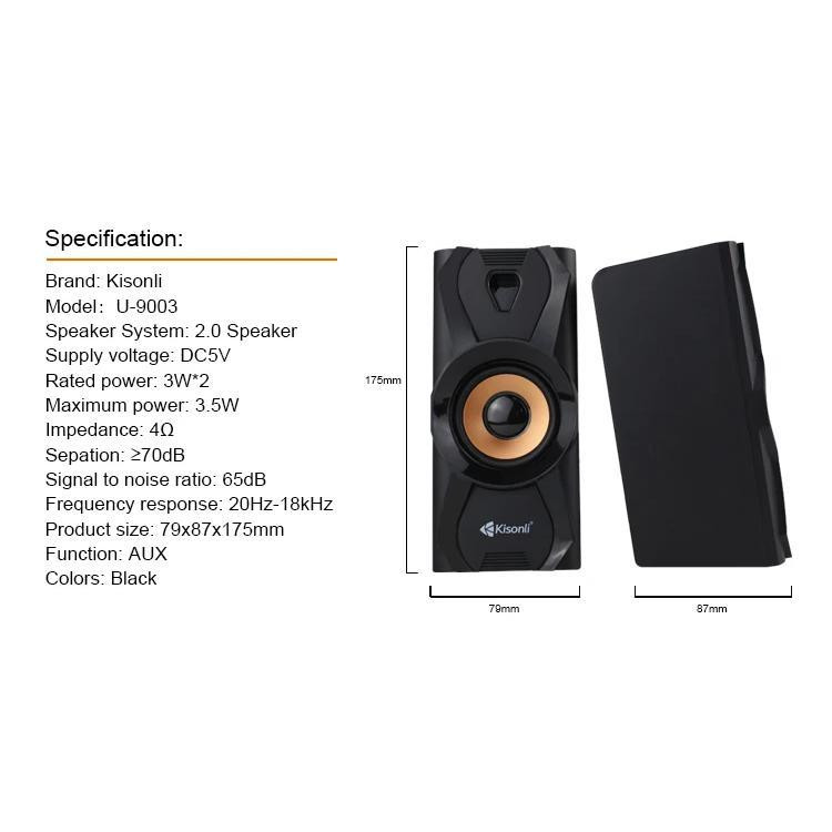 بلندگو های 2.1 کاناله اسپیکر لپ تاپی سه تیکه Kisonli مدل U-9003 با توان خروجی 3 وات در هر باند و توان ساب ووفر نیز در حدود 5 وات با محدوده فرکانس بین 90Hz~20KHz و حساسیت 70 دسی بل پوشش خوبی در محیط های بسته می دهد.