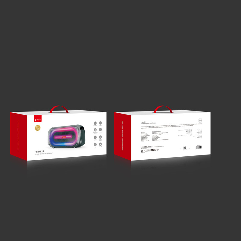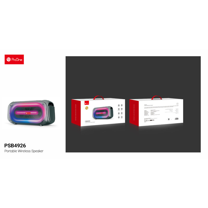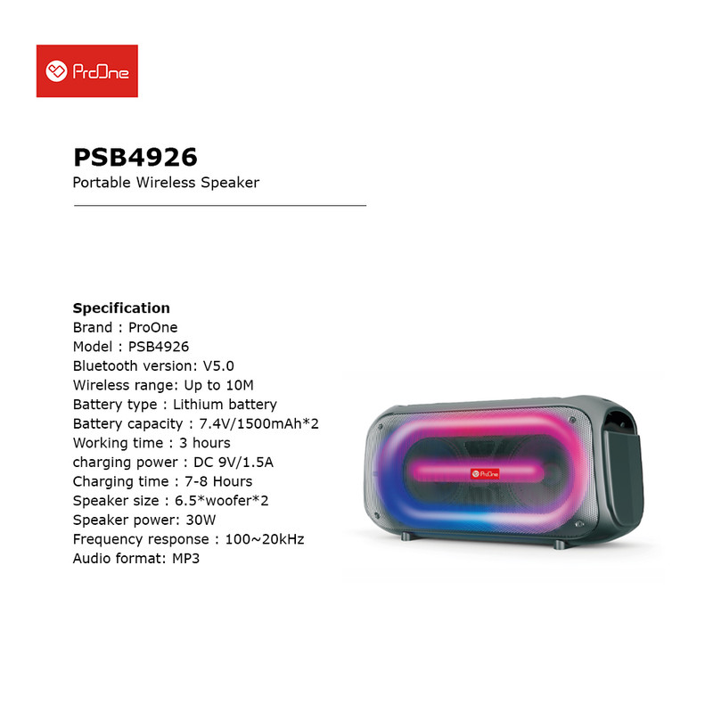 اسپیکر قابل حمل پرووان مدل PSB4926 از جمله اسپیکرهای قابل حملی است که میتواند به لحظه های شما رنگ و بوی ویژهای ببخشد. توان این اسپیکر 30 وات بوده و دارای باتری 1500 میلی آمپری است. این اسپیکر بلوتوثی بوده و محدوده عملکردی آن تا 10 متر خواهد بود. این اسپیکر برای منازل، مهمانی، جلسات، مسافرت ، گردشگری و ... مناسب است.اسپیکر PSB4926 دارای دکمههای متفاوتی نظیر دکمه پاور، کم و زیاد کردن صدا، تنظیم نور و ... است. بدنه این اسپیکر از جنس پلاستیک سخت بوده و کیفیت مناسبی به شما ارائه میکند. این اسپیکر دارای رقص نور بوده و توانایی اتصال به دو دستگاه را بصورت همزمان داراست.اسپیکر قابل حمل پرووان مدل PSB4926 دارای چراغ LED و صفحه نمایش است. اطلاعات مورد نظر را میتوان از طریق این صفحه نمایش مشاهده کنید. از ویژگی های دیگر این محصول میکرفون داخلی آن هست که درصورت نصب کارت حافظه صدای محیط را ظبط میکند.