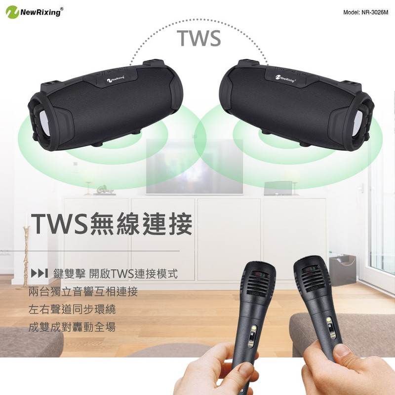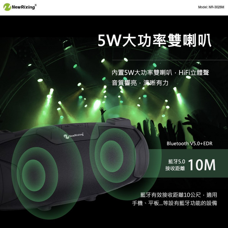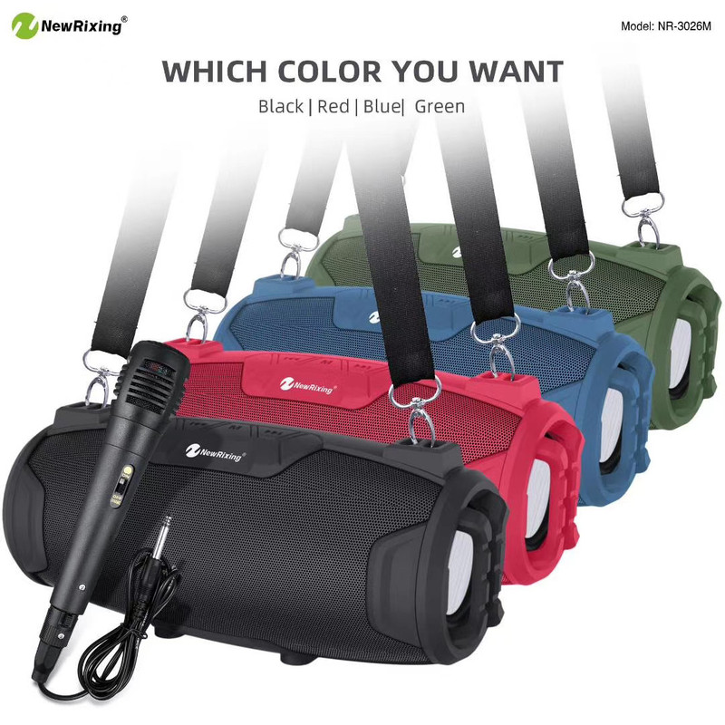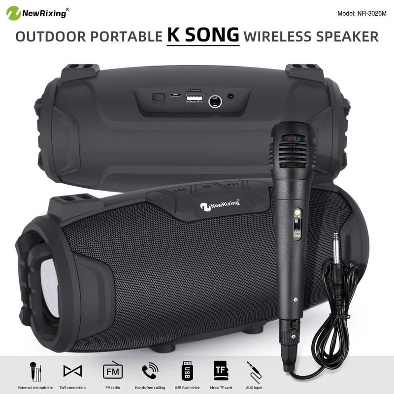اسپیکر «NR-3026M» محصولی از شرکت «NewRixing» است که به صورت بیسیم و از طریق فناوری بلوتوث به تلفنهمراه یا پخشکنندهی صوتی متصل میشود. طراحی این اسپیکر بسیار حرفهای است و به صورت 360 درجه و با قدرت بالا اقدام به پخش موسیقی میکند. این اسپیکر شرکت NewRixing دارای دو ووفر با سایز 4 اینچ و دو توییتر با سایز 20 میلیمتر است که به یاری آنها میتوان شاهد تولید صدایی شفاف و با بیس مناسب بود. توان خروجی اسپیکر NR-3026M برابر با 60 وات در حالت اتصال اسپیکر به برق شهری و 40 وات در حالت استفاده از باتری است. این توان خروجی برای یک اسپیکر، مقدار بسیار زیادی است. فرکانس پاسخگویی اسپیکر NR-3026M شرکت نیورکسینگ برابر با بازهی 100 هرتز تا 20 کیلوهرتز است. اسپیکر NR-3026M را میتوان به صورت همزمان به دو تلفنهمراه یا تبلت متصل کرد. اسپیکر NR-3026M انرژی مورد نیاز خود را از طریق باتری داخلی با ظرفیت 15هزار میلیآمپر تامین میکند. به کمک این باتری میتوان تا 7 ساعت به پخشموسیقی به صورت مداوم پرداخت. اسپیکر NR-3026M دارای یک میکروفن هست که به همراه اسپیکر در جعبه کالا قرار داده شده است که میتوان از آن با این اسپیکر استفاده کرد و لذت برد .