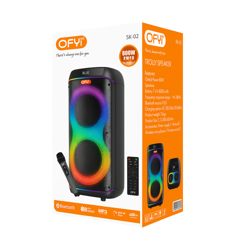 اسپیکر اوفی OFYI مدل SK-02 یک سیستم صوتی قدرتمند است که برای مهمانیها، مراسم و استفاده روزمره طراحی شده است. این اسپیکر دارای دو بلندگوی 8 اینچی با توان خروجی 80 وات واقعی و 800 وات PMPO است که صدای شفاف و پرقدرت را در محیطهای بزرگ ارائه میدهد. ظرفیت باتری آن 7.4 ولت 8000 میلیآمپر ساعت بوده و امکان پخش طولانی مدت موسیقی بدون نیاز به برق مستقیم را فراهم میکند و از طریق شارژر Type-C به راحتی قابل شارژ است.