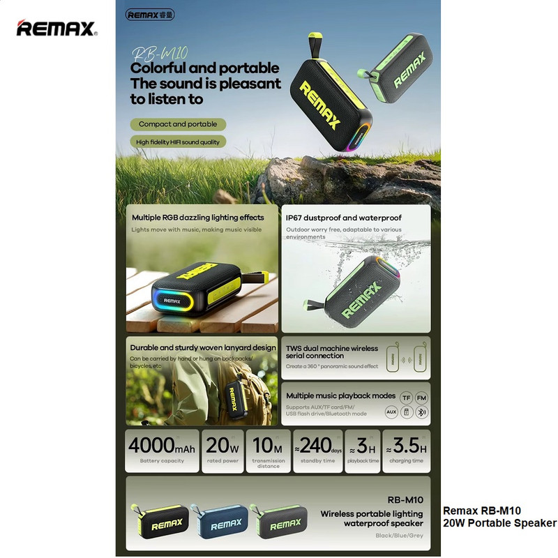 با اسپیکر بلوتوث TWS ضد آب ریمکس مدل SPK Bluetooth RB-M10، موسیقی خود را همه جا با خود ببرید. محصول دارای یک باتری داخلی است که میتواند تا 3 ساعت به طور مداوم موسیقی پخش کند. از اتصال بیسیم از طریق بلوتوث پشتیبانی میکند.دارای طراحی زیبا، اندازه جمع و جور، حمل آسان بوده و از اتصال بیسیم از طریق بلوتوث ، USB فلش، Aux3.5mm ،کارت TF (کارت میکرو SD) پشتیبانی میکند.اتصال بلوتوث آخرین و جدیدترین ورژن 5.4 است که میتوان از پخش بیوقفه لذت ببرید و اتصالی پایدار تا 10 متر دورتر ارائه دهد.قابلیت اتصال همزمان دو دستگاه اسپیکر بصورت (Wireless Pairing 360) در حالت TWS (بیسیم واقعی) دارد.دارای دسته برای حمل و نقل آسان و چراغ نشانگر وضعیت کار می باشد.چراغهای RGB وجود دارند که میتوانید رنگها را تغییر دهید.با جلوههای نوری شیک ،تجربه شنیداری خود را بهبود بخشید و فضایی پر جنب و جوش برای هر مناسبتی ایجاد کنید.جنس آن از پلاستیک ABS ضخیم و محکم است. قسمت جلویی از جنس مش است.دارای استاندارد ضد آب IPX67 است که بدون نگرانی در هر نوع آب و هوایی قابل استفاده می باشد .استاندارد IP67 یک رتبه بندی بین المللی است که نشان دهنده میزان مقاومت یک دستگاه در برابر نفوذ گرد و غبار و آب است. در این استاندارد، عدد 6 نشان دهنده مقاومت کامل در برابر نفوذ گرد و غبار، و عدد 7 نشان دهنده مقاومت در برابر باران و قطرات ریز و همچنین غوطه ور شدن موقت در آب تا عمق 1 متر است.با این بلندگوی جمع و جور و ضد آب، موسیقی خود را به هر جایی ببرید، ایدهآل برای مهمانیهای کنار استخر، سفرهای ساحلی یا ماجراجوییهای فضای باز است.با ظرفیت باتری 4000 میلیآمپر ساعت، با یک بار شارژ(پورت Type-C) تا 3 ساعت از پخش مداوم لذت ببرید و تا 240 روز در حالت آماده بکار می ماند. مجهز به بلندگوهای 20 واتی بوده که باعث میشود صدایی غنی و فراگیر را تجربه کنید، ایدهآل برای استفاده در فضای داخلی و خارجی است.دارای دکمههای کنترل پخش موسیقی و تنظیم صدا از روی اسپیکر است.با اسپیکر بلوتوثی ضد آب ریمکس مدل RB-M10 از موسیقی خود در هر زمان و هر مکان لذت ببرید.