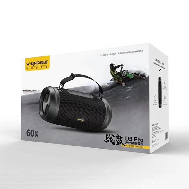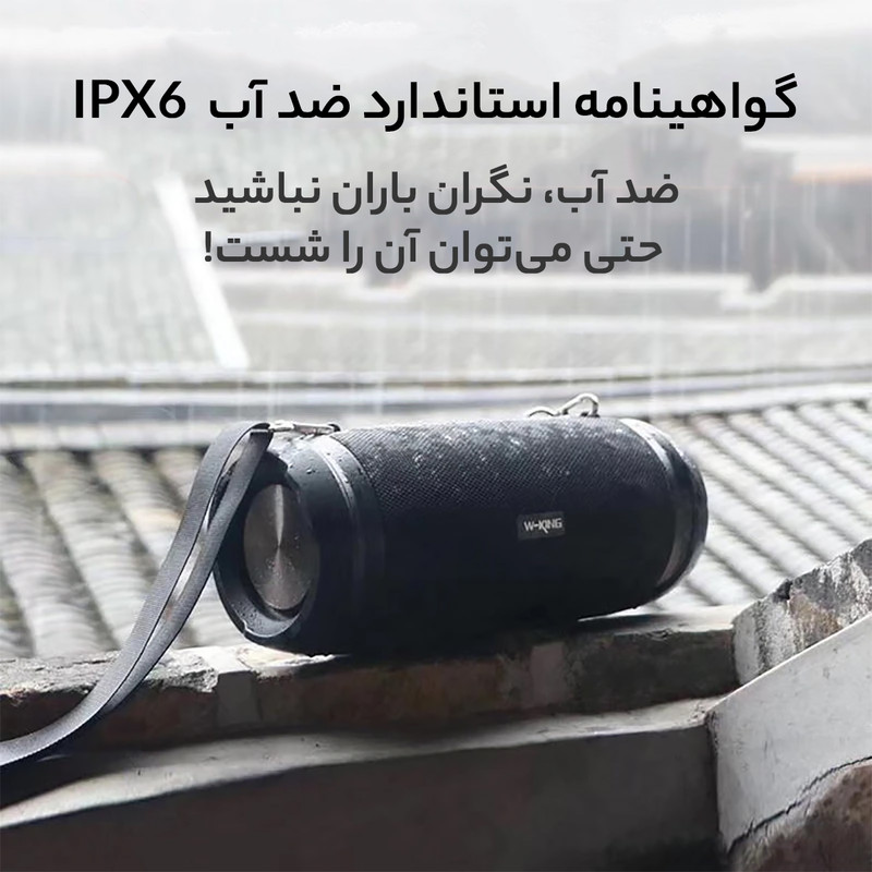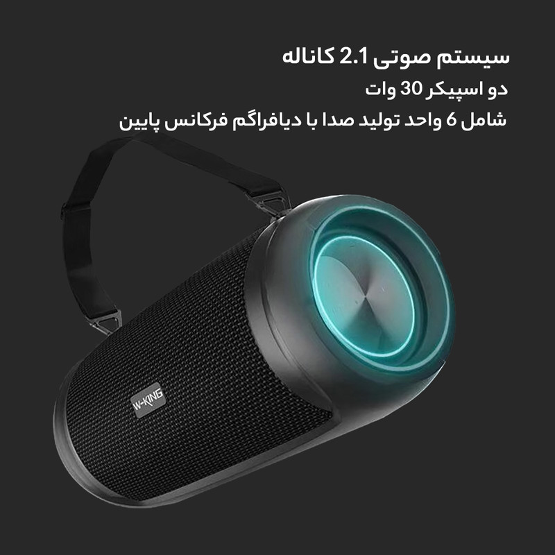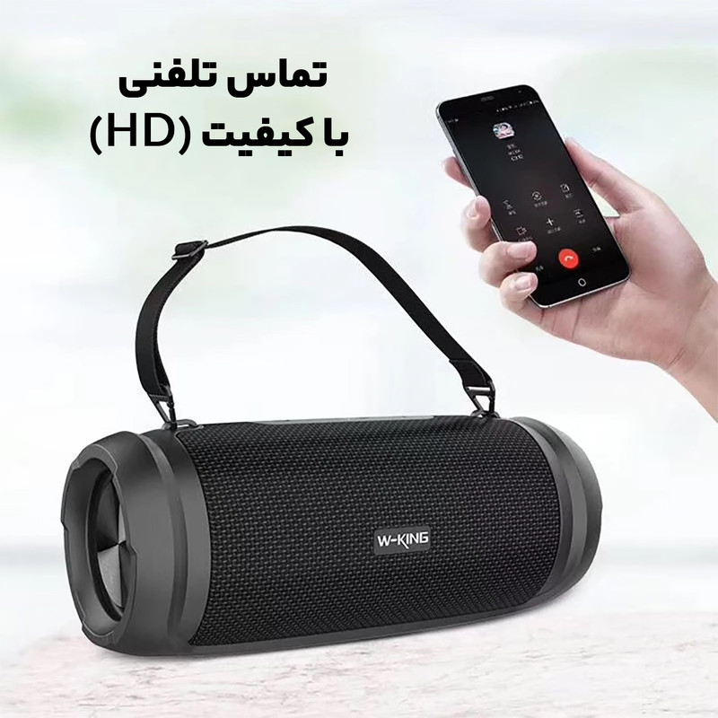 اسپیکر بلوتوثی W-King D3 Pro توان فوق العاده خوبی دارد و صدای بی نظیری را برای شما خواهد داشت. این اسپیکر دارای فرم استوانه است که میتواند به شما صدایی 360 درجه بدهد. کلیدهای کنترل صدا و موسیقی نیز روی بدنه تعبیه شده است. این اسپیکر دارای 20 توییتر هستهای است و توییترهای 2.75 میلی متری میان رده نیز دارد. همچنین ساب ووفرای اسپیکر هم دارای ابعاد 4 اینچی هستند. در مجموع دو خروجی با توان 30 وات در این هندزفری وجود دارند که توان خروجی کلی را در آن برابر با 60 وات می کند. خروجی این اسپیکر 2.1 کاناله است. اسپیکر W-King D3 Pro دارای قابلیت IPX6 نیز هست، به این معنی که میتواند در برابر رطوبت و آب مقاومت خوبی داشته باشد. این اسپیکر دارای اتصال بلوتوث نسخه 4.2 است و با کمک آن میتوانید به راحتی و بدون قطعی به دستگاههای مورد نظر خود وصل شوید. این نسخه از بلوتوث قابلیت پخش تا 10 متر، بدون وجود مانع، را داراست. علاوه بر توانایی استفاده از این اسپیکر به عنوان یک اسپیکر بلوتوثی، قابلیت اتصال از طریق درگاه 3.5 میلی متری صدا یا همان AUX نیز امکان پذیر است. اسپیکر دبلیو کینگ D3 Pro دارای درگاه رم microSD نیز هست و میتوانید موسیقیهای مورد علاقهتان را روی رم ذخیره کرده و اجرا نمایید. مورد دیگر، قابلیت وصل کردن فلش مموری USB است که می توانید از آن طریق نیز موسیقی مورد نظر خود را پخش کنید. باتری داخلی اسپیکر W-King D3 Pro ظرفیتی معادل 10000 میلی آمپر ساعت دارد و در یک بار شارژ میتواند حدود 6 الی 8 ساعت، با توجه به کم و زیادی حجم صدا، به پخش موسیقی بپردازد. این اسپیکر دارای یک میکروفون درونی نیز هست که توسط آن اگر تماس دریافتی داشتید، می توانید امکان پاسخگویی نیز داشته باشید و مکالمه کنید. برای حمل و جابجایی اسپیکر نیز یک بند تعبیه شده است که میتوانید با استفاده از آن D3 Pro را به راحتی حمل کنید. این اسپیکر از قابلیت DSP یا Digital Signal Processing پشتیبانی میکند. این قابلیت به معنای این است که صدا را به اطلاعات دیجیتالی تبدیل میکند و به این صورت میتوانید صدایی با نویز کمتر بشنوید و کیفیت بالایی از صدا را تجربه کنید. با قابلیت EQ نیز شما میتوانید اکوهای مختلفی را روی صدا قرار داده تا با توجه به موسیقی، بهترین فرم صوت را بشنوید.