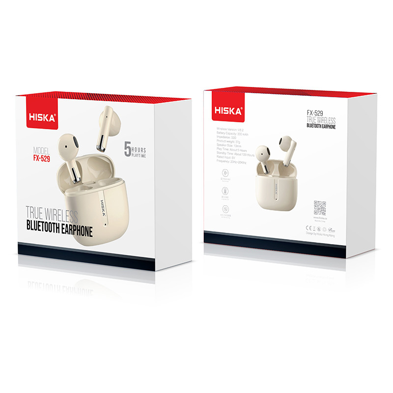 ایرفون های هندزفری بلوتوث FX-529 هیسکا به صورت Semi In-Ear است که به شکل کامل درون گوش جای میگیرند و به محض اینکه آنها را درون گوش خود میگذارید، کم شدن نویز و صداهای اضافی محیط را متوجه میشوید. ایرفون ها وزن بسیارکمی دارند که باعث شده تا در طولانی مدت امکان استفاده از آن را داشته باشید و کمتر خسته شوید. هندزفری هیسکا FX-529 دارای بلوتوث نسخه 5.2 است. با استفاده از این هندزفری می توان تا فاصله ده متری (بدون هیچ مانعی) بدون افت کیفیت به موسیقی گوش داد. از دیگر قابلیتهای بلوتوث نسخه 5.2 اتصال پایدارتر است. اگر گوشی شما نیز دارای نسخه 5.2 بلوتوث باشد، باتری استفاده شده از هندزفری و گوشی، کمتر خواهد بود. بر روی این هندزفری بلوتوثی ، پنلهای لمسی قرار داده شده است که با لمس کردن این پنلها میتوانید کاربردهای مختلفی را که هیسکا برای شما در نظر گرفته است انجام داده و در کل کاربری راحتتری داشته باشید. هندزفری بلوتوث FX-529 دارای باتری با ظرفیت 300 میلی آمپر ساعت است. میزان شارژدهی برای ایرفون های این هندزفری جهت شنیدن موسیقی 5 ساعت و مکالمه 4 تا 5 ساعت می باشد.
