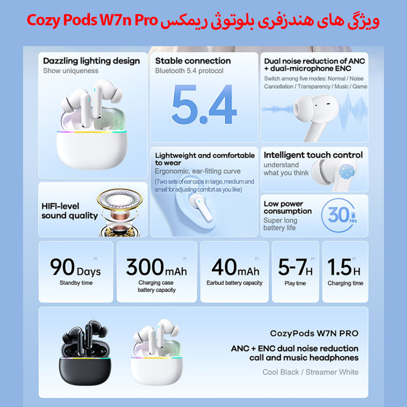 Cozy Pods W7n Pro دارای قابلیت نویز کنسلینگ فعال (ANC) است و نویز محیط را تا حد قابل توجهی کاهش میدهد، بنابراین تمرکز روی موسیقی یا مکالمه راحتتر صورت میگیرد. هدفون از طریق بلوتوث نسخه ۵.۴ به دستگاههای مختلف متصل میشود و محدوده عملکرد تا ۱۰ متر امکان جابهجایی بدون قطعی را فراهم میکند. انرژی هدفون از باتری داخلی ۴۰ میلیآمپرساعت تأمین شده و امکان پخش موسیقی بین ۵ تا ۷ ساعت وجود دارد، در حالی که محفظه شارژ با ظرفیت ۳۰۰ میلیآمپرساعت امکان شارژ مجدد هدفون را فراهم کرده و زمان لازم برای شارژ کامل هدفون ۱.۵ ساعت است.