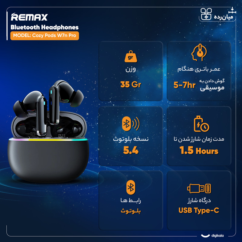 هدفون بلوتوثی ریمکس مدل Cozy Pods W7n Pro ترکیبی از طراحی جمعوجور، کیفیت صدای مناسب و قابلیتهای مدرن را ارائه میدهد که استفاده روزمره و کاربری عمومی را راحت و لذتبخش میکند. این هدفون تو گوشی (Earbud) با دو گوشی جداگانه ساخته شده و با قطر درایور ۱۰ میلیمتر تجربه شنیداری استریو و وضوح صوتی بالایی فراهم میکند. بدنه از پلاستیک مقاوم ساخته شده و سبک بودن آن، حمل و استفاده طولانیمدت را آسان کرده است. علاوه بر این، مقاومت در برابر تعریق و پاشش آب با استاندارد IPX4، امکان استفاده در شرایط مختلف مانند ورزش یا پیادهروی را فراهم میکند.