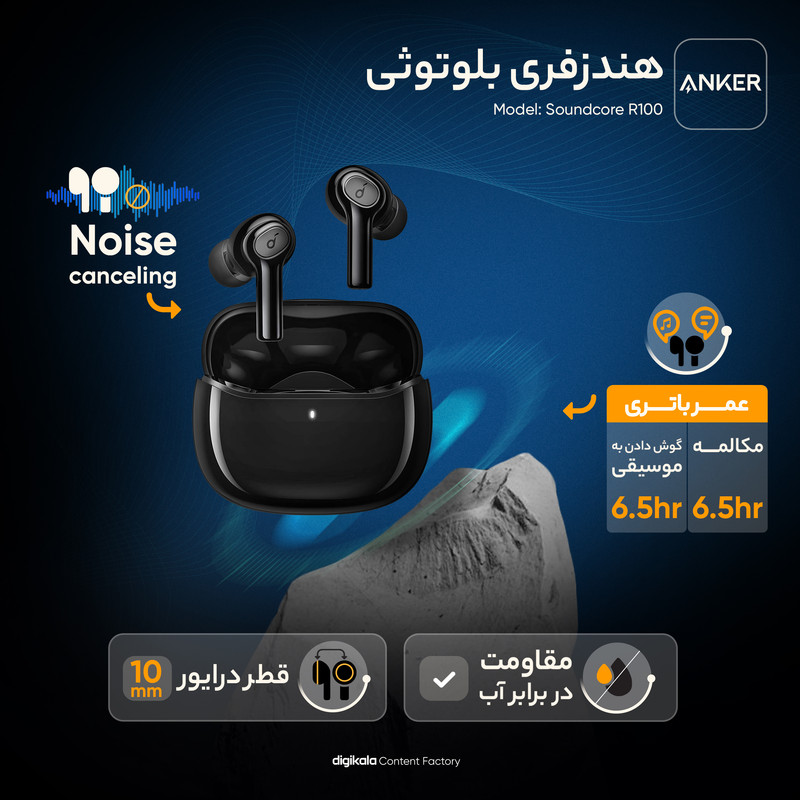 کیس شارژ هندزفری بلوتوث انکر Soundcore R100 به یک باتری لیتیوم پلیمری با قابلیت شارژ سریع مجهز شده است. شارژ آن از طریق پورت USB Type-C انجام میشود که حدود 2 ساعت طول خواهد کشید؛ این باتری قادر است انرژی مورد نیاز برای پخش موزیک تا 6.5 ساعت را برای ایرپادها فراهم کند. همچنین باکس شارژ میتواند تا 25 ساعت شما را بدون نیاز به شارژ نگه دارد. گفتنی است ایرپادها هم از قابلیت شارژ سریع پشتیبانی برخوردارند و با تنها 10 دقیقه شارژ، میتوانید 1 ساعت از آنها استفاده کنید.