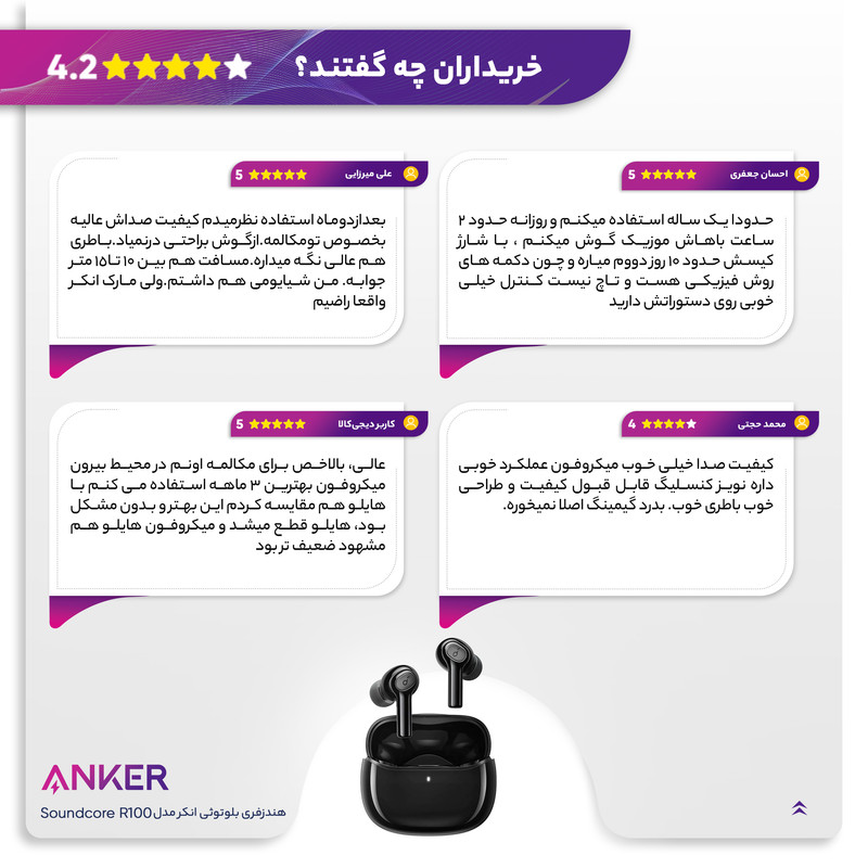 هدفون بلوتوثی اَنکر Soundcore R100 با داشتن دو میکروفون داخلی با فناوری نویز کنسلینگ، امکان برقراری تماسهای تلفنی شفاف و واضح را برای شما فراهم خواهد کرد. Anker R100 با گوشیهای ارگونومیکی که دارد و قابلیت تنظیم سایز سریها با اندازه گوش، به خوبی درون گوش فیکس میشود تا حین دویدن و واکنش سریع بدن سقوط نکند. همچنین این هدفونهای بیسیم با داشتن گواهی استاندارد IPX5، ضدآب هستند و درصورت تعریق هنگام ورزش یا تماس با رطوبت و گرد و غبار، مقاومت خوبی نشان میدهند. فناوری بلوتوث نسخه 5.0 این هدفونها تا شعاع 10 متری اتصال خود را با گوشی موبایل، تبلت یا دیگر دستگاههای هوشمند موردنظرتان حفظ خواهد کرد. این محصول میتواند با دستگاههایی که سیستم عامل Android 5.0 یا بالاتر را دارند جفت شود. همچنین اگر از کاربران اپل هستید نگران نباشید، این هندزفری بلوتوثی با سیستم عامل iOS 10 یا بالاتر هم کاملا سازگار است و مجموعهای از پروتکلهای A2DP ، AVRCP ، HFP را پشتیبانی میکند. این هدفون به لطف درایور 10 میلیمتری و تکنولوژی BassUp میتواند صدایی با کیفیت و باس بالا برای شما پخش کند تا نهایت لذت را از شنیدن موسیقی ببرید.