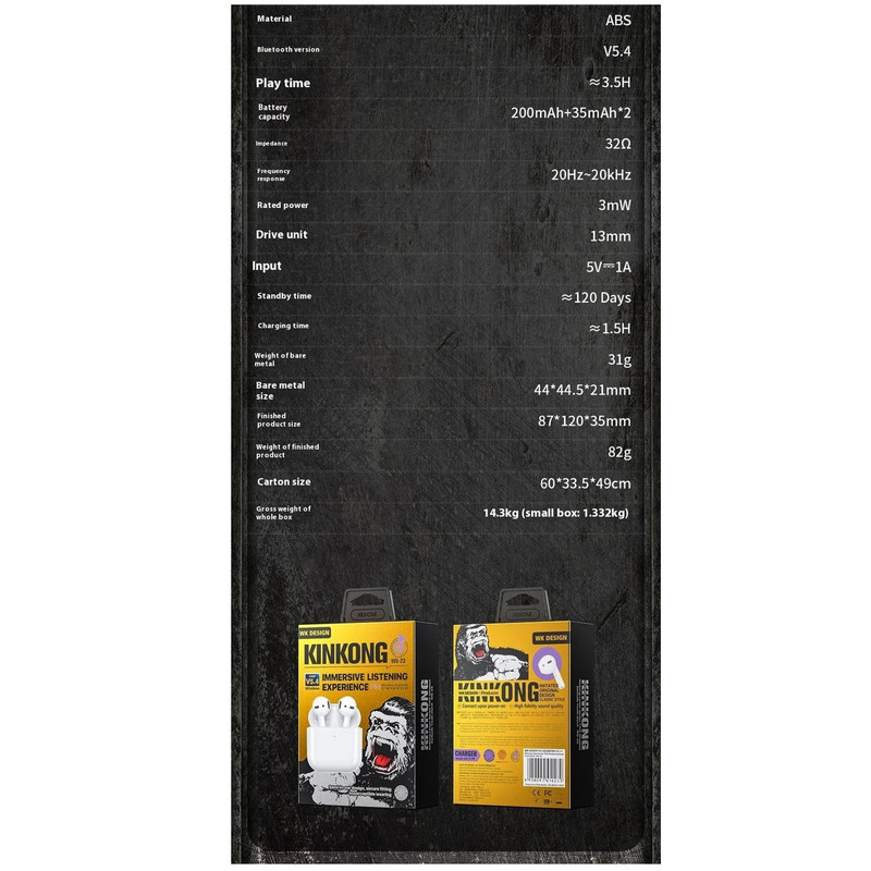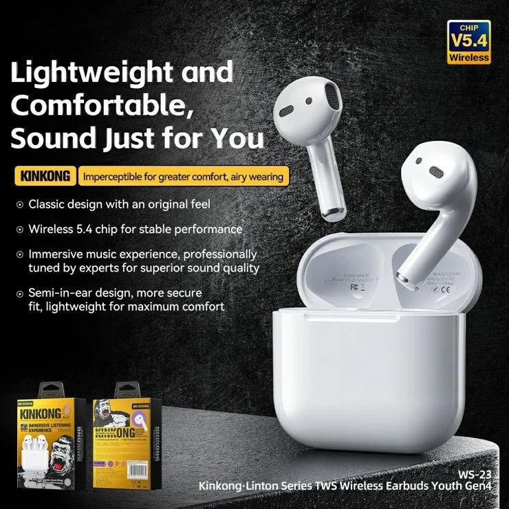هدفن بلوتوس مدل KINKONGWS-23 ایرپادی با طراحی قوی میباشد.نسخه چیپست بلوتوث بکار رفته در این مدل 5.4 میباشد که باعث اتصالی سریع و پایدار میشود و همچنین شارژ کمتری مصرف میکند. در میکروفون های این مدل از تکنولوژی نویز کنسلینگ ENC میباشد که باعث میشود بصورت کامل توجهی صدای محیط در حین تماس حذف شود. ظرفیت باتری این ایرپاد 300 میلی آمپر ساعت میباشد که در یک ساعت کاملا شارژ میشودو تا 4 ساعت شارژ نگه میدارد. گوشی های این مدل دوام و راحتی در حین استفاده طراحی شده اند که در طولانی مدت شما را خسته نمیکد.