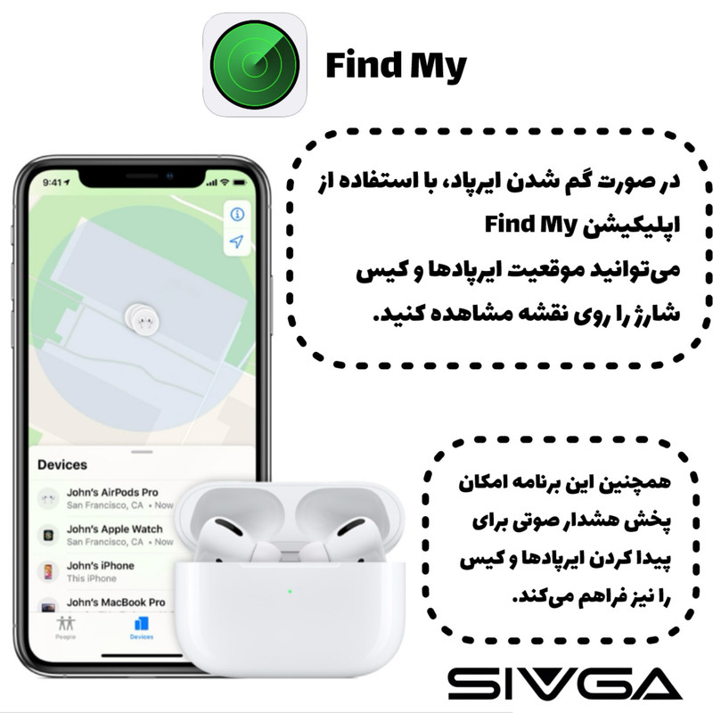 یکی از ویژگی های این ایرپاد Findmy این محصول هست که امکان ردیابی با gps و اعلام هشدار هم روی کیس و هدفون ها را دارا هست.