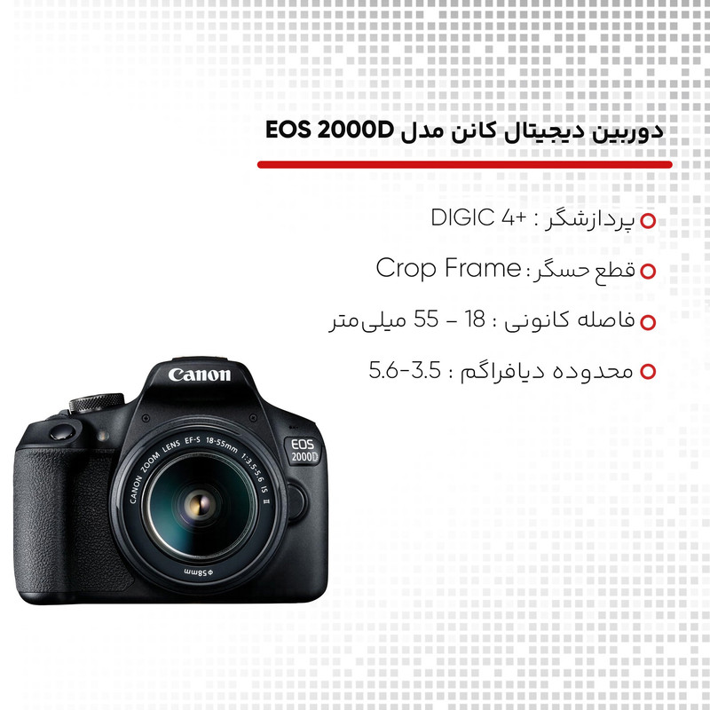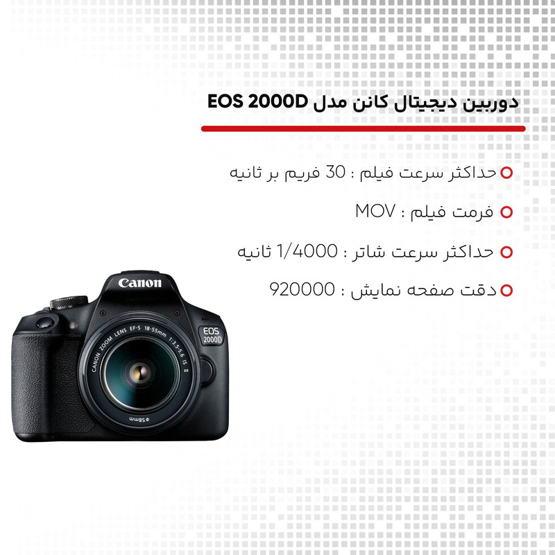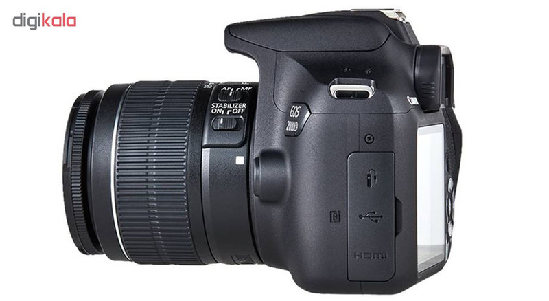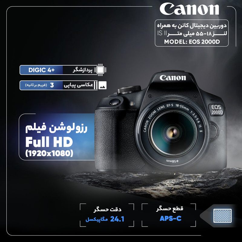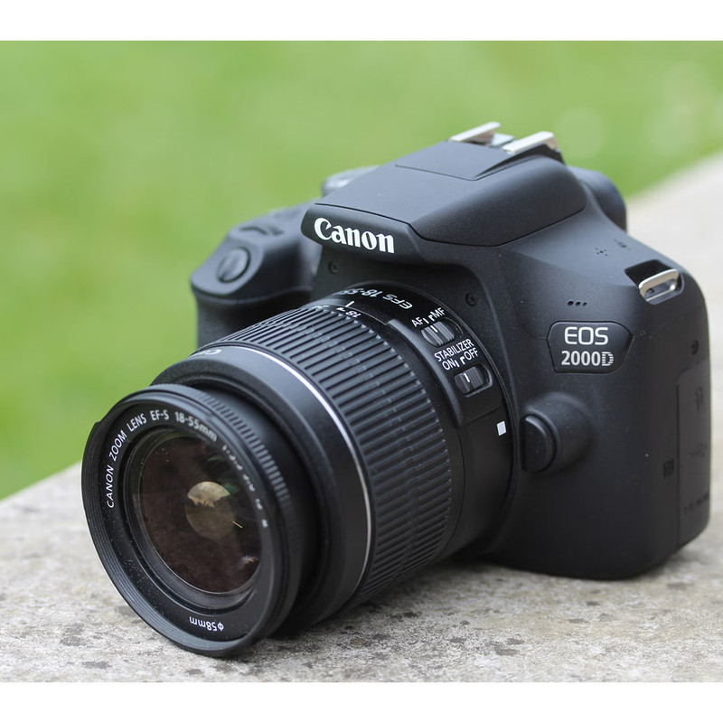 مدل «2000D» در سری دوربینهای مبتدی DSLR کانن قرار میگیرد. این مدل را کمپانی مشهور «کانن» (Canon) تولید کرده است و همراه آن لنز 18-55 میلیمتری ارائه میشود. 18-55 لنز نرمالی است که میتوانید با آن محدودهی قابلقبولی را هنگام عکاسی پوشش داده و عکسهای واضح و باکیفیتی ثبت کنید. برای توضیح دربارهی مشخصات فنی این دوربین، باید گفت که 2000D با برخورداری از عالیترین سطح تنظیمات دستی و پیشرفتهترین تکنولوژیهای بهروز دوربینهای دیجیتال و همچنین قیمتی بهصرفه و مناسب، نزد مشتاقان عکاسی و آنان که در ابتدای راه عکاسی حرفهای هستند، از محبوبیت بسیار زیادی برخوردار است. دوربین کانن «EOS 2000D» از حسگر 24.1 مگاپیکسلی CMOS و پردازشگر تصویر +DIGIC 4 بهره میبرد که ترکیب این دو، ثبت تصاویری با کیفیت فوقالعاده را حتی در شرایط نوری ضعیف تضمین میکند. این دوربین خوشدست، 475 گرم وزن دارد. سمت راست بدنهی این دوربین، یک برآمدگی دارد تا راحتتر در دست جای بگیرد. Canon EOS 2000D دارای یک صفحهنمایش LCD در اندازهی سه اینچ با دقت 920000 نقطه و چشمی اپتیکال است. عکسها و فیلمهای ضبطشدهی این دوربین، روی کارت حافظهی SD ذخیره میشوند. این دوربین قیمتی بهصرفه دارد و کانن با طراحی آن، کاربران مبتدی را نشانه گرفته است تا با استفاده از آن اولین قدم را در دنیای عکاسی بردارند و مهارتهای خود را به چالش بکشند. دوربین 2000D دامنهی حساسیت 100-6400 دارد و تا 12800 هم قابلارتقا است. وجود قابلیت سلفتایمر باعث میشود بتوانید دوربین را در محل دخواه خود قرار داده و بین 2 تا 10 ثانیه بعد به صورت خودکار عکس بگیرد. در مجموع این دوربین برای کاربرانی که تازه عکاسی را شروع میکنند گزینهی مناسبی محسوب میشود. حداکثر سرعت فیلمبرداری این دوربین 30 فریمبرثانیه است.