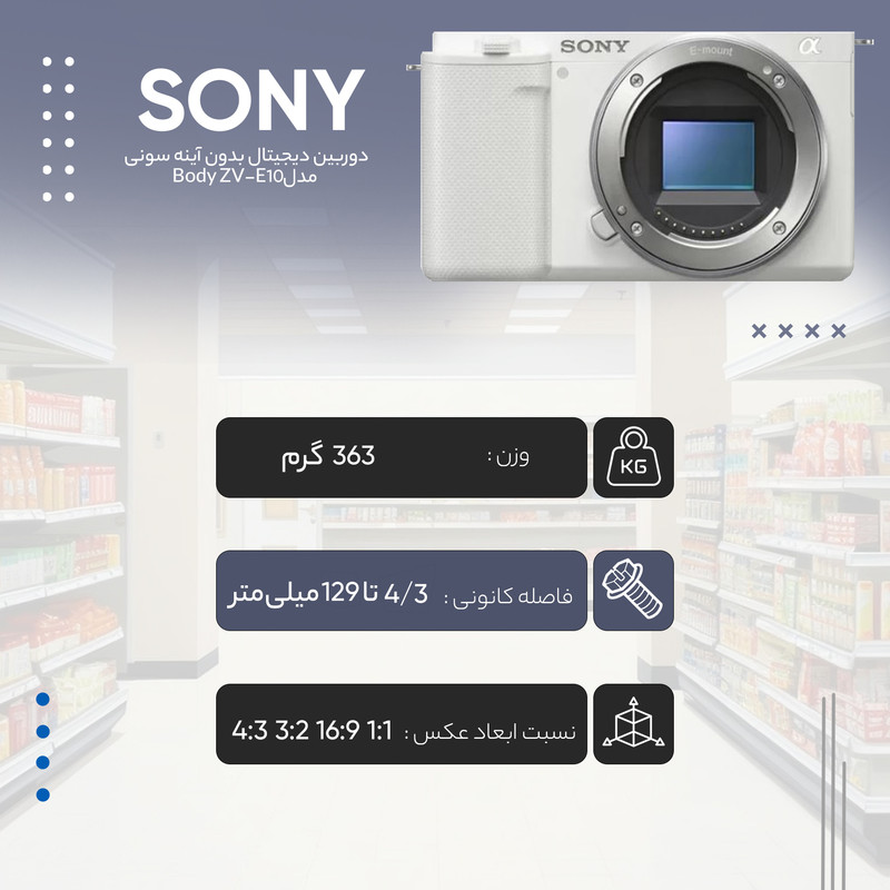 این دوربین از درگاههای USB، HDMI، ورودی میکروفون، Wi-Fi و بلوتوث پشتیبانی میکند و از نظر اتصال و انتقال فایل یا کنترل بیسیم امکانات کاملی ارائه میدهد. با وزن تنها ۳۴۳ گرم و ابعاد ۱۱۵.۲×۶۴.۲×۴۴.۸ میلیمتر، ZV-E10 برای حمل روزانه یا استفاده در سفر گزینهای سبک و کاربردی محسوب میشود.