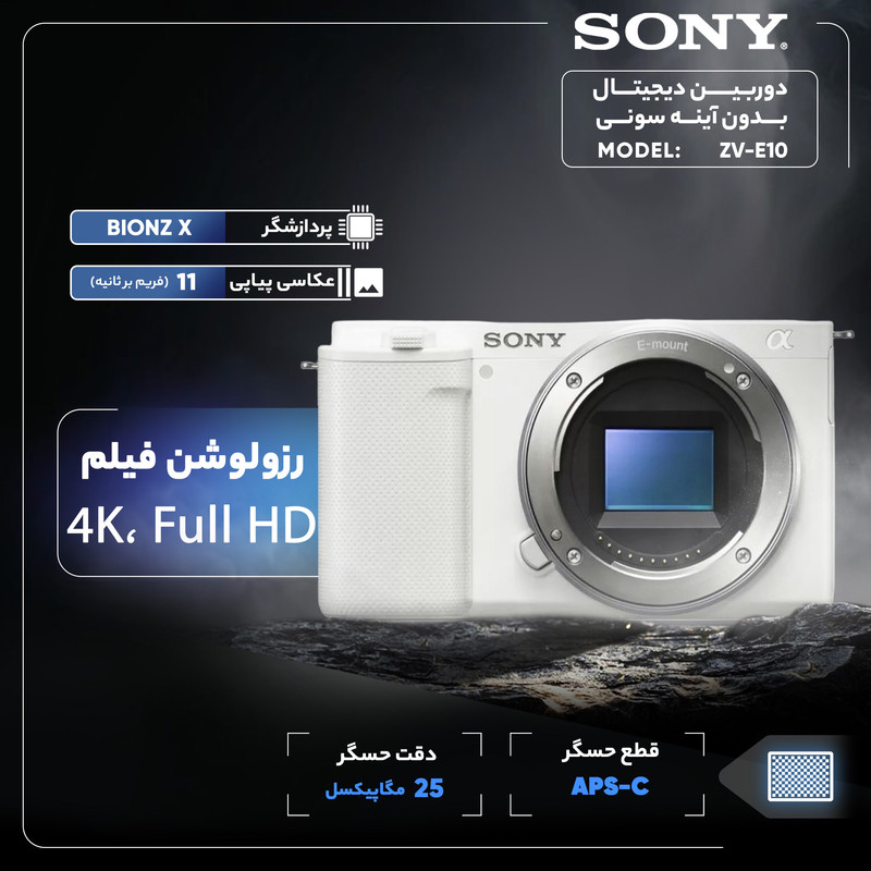 دوربین دیجیتال بدون آینه سونی مدل ZV-E10 Body برای تولیدکنندگان محتوا طراحی شده که به دنبال کیفیت تصویر بالا، امکانات حرفهای و ابعادی جمعوجور هستند. این دوربین با حسگر کراپفریم APS-C و دقت ۲۵ مگاپیکسل، تصاویری با وضوح مناسب و عمق میدان سینمایی ثبت میکند.