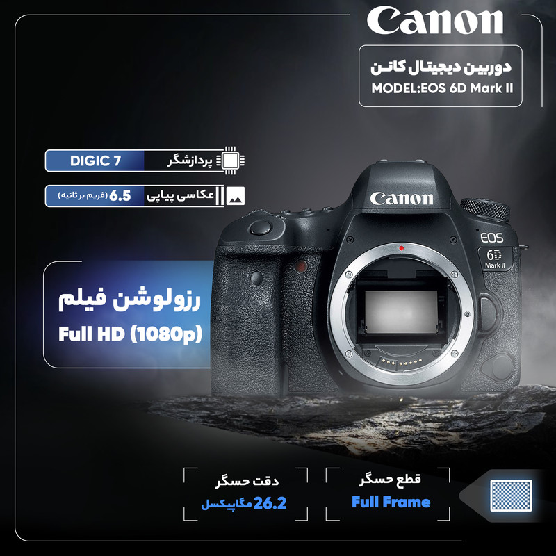 EOS 6D Mark II یک دوربین فولفریم از کانن است که پیشرفتهای قابلتوجهی را نسبت به نمونه قبلی خود داشته و قابلیتهای متنوعی را در خلق تصویر ارائه میدهد. این دوربین با برخورداری از یک حسگر CMOS فولفریم با رزولوشن 26.2 مگاپیکسلی و پردازنده Digic 7 میتواند تا 6.5 فریمبرثانیه به صورت پیدرپی عکاسی کند. به لطف این حسگر جدید کانن، تصویر با وضوح و جزییات بالایی با سرعت عمل بالا به ثبت خواهد رسید. دامنه ایزو 6D Mark II نیز نسبت به برادر بزرگتر خود، 6D، افزایشیافته و میتوان از 100 تا 40000 آن را تنظیم نمود. با تقویت سیگنال میتوان این عدد را از 50 تا 102400 گسترش داد. کانن برای رسیدن به فوکوسی دقیق و مطمئن در 6D Mark II یک سیستم فوکوس 45 نقطهای Dual pixel را در این دوربین به کار گرفته است. این نقاط فوکوس همگی از نوع کراس هستند تا بتواند بر روی سوژههای مختلف و حتی در شرایط نسبتاً تاریک نیز بر روی سوژه فوکوس کرد. در حالت فیلمبرداری نیز ردیابی خودکار سوژه و فوکوس بر روی آن با دقت و سرعت بیشتری انجام میشود. هرچند که این دوربین در حالت فیلمبرداریحداکثر با رزولوشن Full HD تصاویر را میتواند ذخیره کند ولی میتوان به صورت HDR به فیلمبرداری پرداخت یا با استفاده از اینتروالداخلی دوربین، با رزولوشن 4K تصاویر تایملپس جذابی را خلق کرد. دوربین 6D Mark II کانن دارای یک حسگر 3 اینچی است که قابلیت چرخش دارد. اگر چه این قابلیت در دوربینهای SLR امروزی ویژگی جدیدی به حساب نمیآید ولی در دوربینهای فولفریم کانن این یک پیشرفت قابلتوجه بهحساب میآید. 6D Mark II اولین دوربین فولفریم کانن است که میتوان نمایشگر آن را در جهتهای مختلف چرخاند. کانن در طراحی بدنه این دوربین نیز نسبت به نمونه قبل تغییرات را انجام داده که درنتیجه آن با بدنهای ارگونومیک و با استحکام بالایی روبهرو هستیم. از دیگر ویژگیهای 6D Mark II میتوان به جیپیاس، بلوتوث و وایفای داخلی آن و مقاومت آن در برابر نفوذ رطوبت و گردوغبار اشاره کرد.