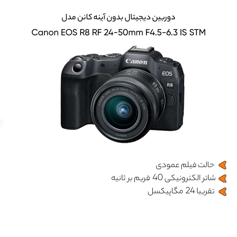 دوربین دیجیتال بدون آینه کانن مدل EOS R8 همراه با لنز RF 24-50mm F4.5-6.3 IS STM، گزینهای سبک و جمعوجور برای علاقهمندان به عکاسی فولفریم است. این دوربین با وزن تنها ۴۱۴ گرم و ابعاد ۱۳۳×۸۶×۷۰ میلیمتر، حمل و استفاده آسانی در محیطهای مختلف فراهم میکند.