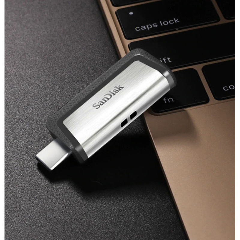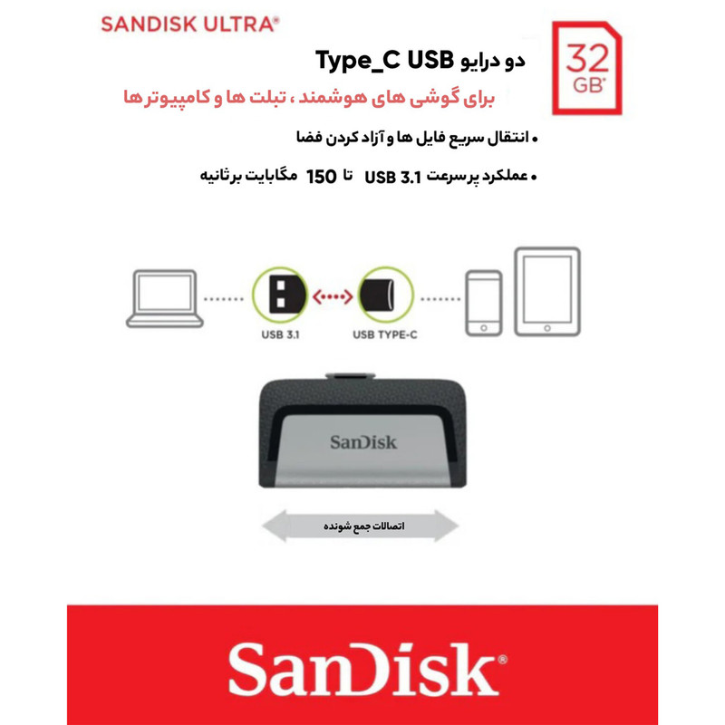 فلشمموری «سندیسک» مدل «Ultra Dual Drive USB Type-C» با دو درگاه USB3.1 و USB Type-C به رایانه و تلفنهمراه شما متصل میشود و شما را در ذخیرهسازی اطلاعات مهمتان همراهی میکند. در قسمت میانی این فلشمموری یک اهرم کشویی برای سوییچکردن بین دو رابط آن مشاهده میشود. برای اتصال Ultra Dual Drive USB Type-c به کامپیوتر کافی است که از درگاه USB3.1 آن استفاده کرد و برای اتصال فلشمموری به تلفنهمراه یا تبلت باید از درگاه USB Type-C بهره برد. البته باید به این نکته اشاره کرد که برای استفاده از Ultra Dual Drive USB Type-c در تلفنهمراه حتما باید درگاه USB Type-C در تلفنهمراه هوشمندتان پشتیبانی شود. درگاه USB3.1 میتواند تا دو برابر درگاههای USB3.0 به انتقال اطلاعات بپردازد. سرعت انتقال دادهای که شرکت سندیسک برای این محصول ارائه کرده، تا 130 مگابایت بر ثانیه است که سرعت بسیار بالایی برای فلشمموریها به شمار میرود. اگر قصد تهیهی یک فلشمموری برای انتقال و ذخیرهسازی اطلاعات با سرعت زیاد را دارید، Ultra Dual Drive USB Type-c میتواند انتخاب مناسبی برای شما باشد. این فلشمموری دارای ظرفیت 32 گیگابایت است که برای کاربرانی که اطلاعات زیادی دارند، مناسب است. فلشمموری Ultra Dual Drive USB Type-c ابعاد و وزن بسیار کمی دارد که به کاربر این امکان را میدهد که همیشه آن را به همراه داشته باشد. جنس بدنهی این محصول ترکیبی از پلاستیک و فلز است که میتواند مقاومت خوبی از خود در برابر صدمات روزمره نشان دهد.