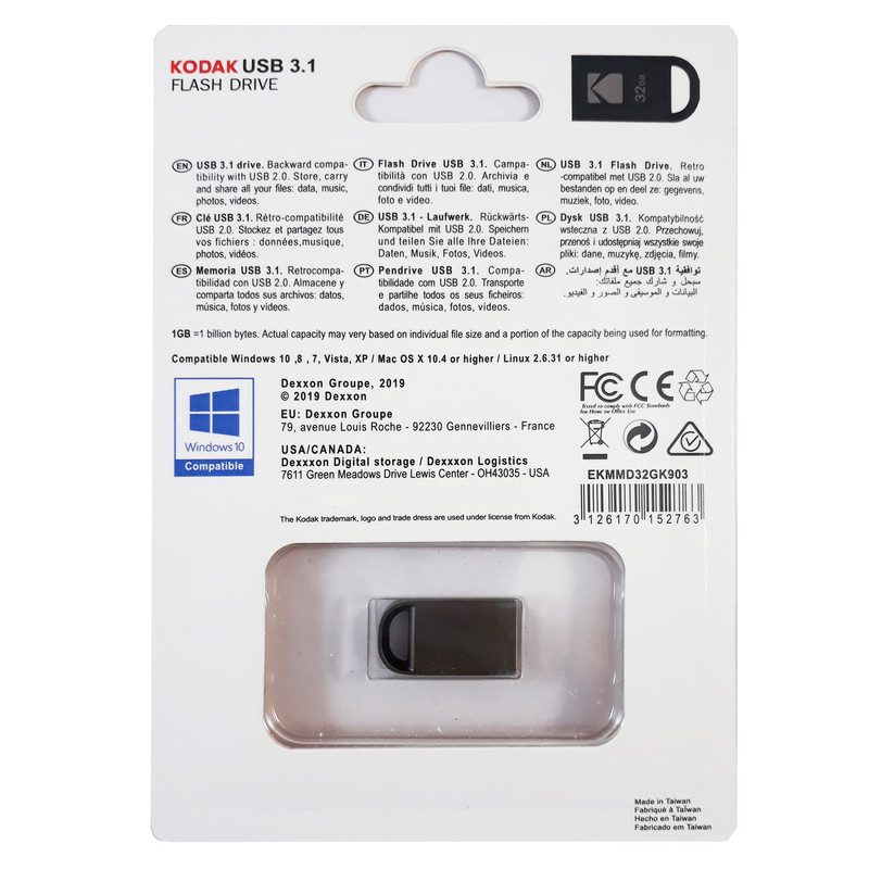 فلش مموری «Mini Metal K903» برند «Kodak» با ظاهری فلزی و بدنهی محکم، تصویری جدید را از یک حافظه جانبی، به کاربر ارائه میدهد و از رابط USB 3.1 بهره می برد. این فلش مموری که توسط یک محفظه فلزی محافظت میشود، از حافظهی 64 گیگابایتی بهره میبرد و به دلیل بهرهبری از تکنولوژی COB، تا حدودی در مقابل فشار و ضربه و همچنین گرد و غبار و آب مقاوم است. طراحی بدون درب این فلش مموری بسیار کاربرپسند است.