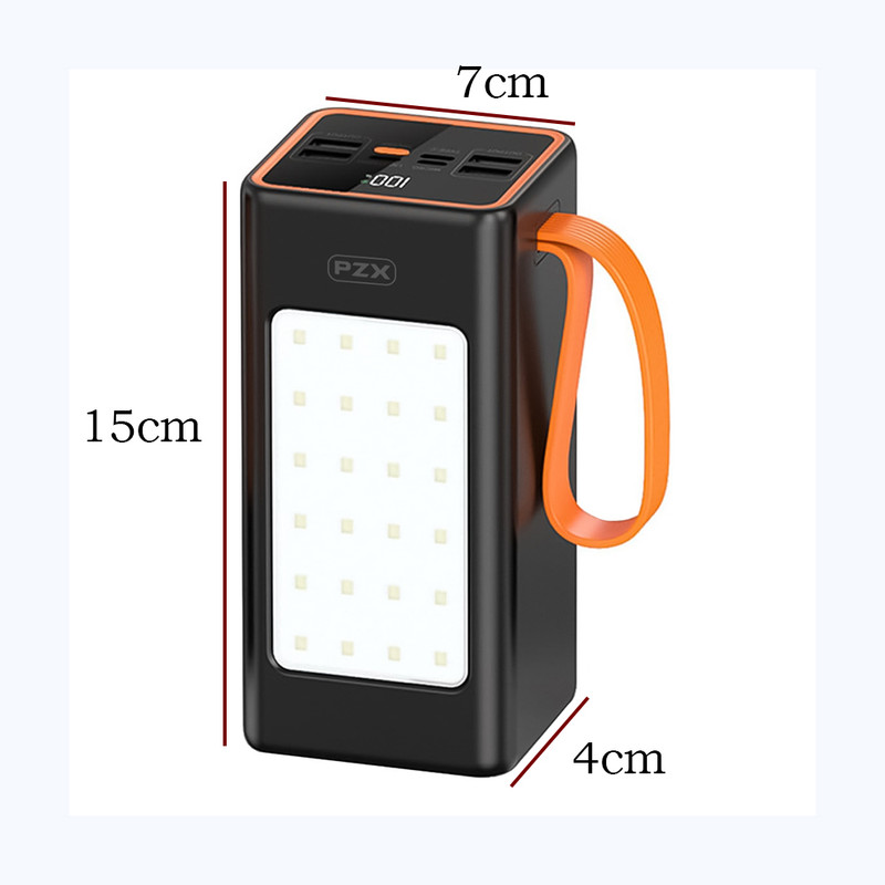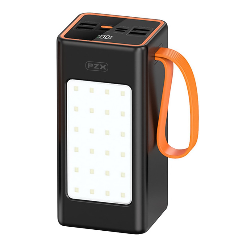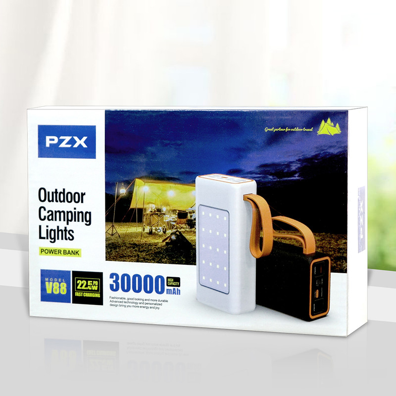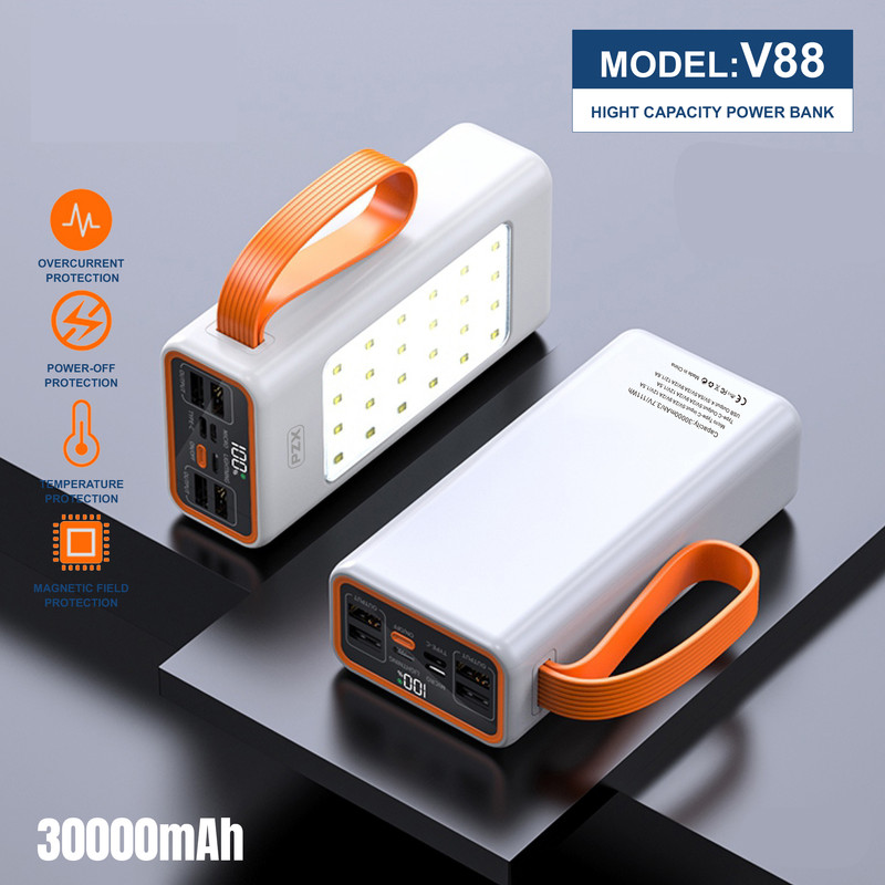 افراد ماجراجو و اهل کمپ و سفر حتما تا آخر بخوانید. در نگاه اول پس از بازکردن جعبه، با یک صفحه بزرگ دارای بیست ال ای دی (چراغ پاوربانک) و طراحی بسیار زیبا مواجه خواهید شد. بند آویز سیلیکونی نارنجی رنگ مشخصا بیانگر این است که این محصول برای افرادیست که میخواهند مدت زیادی در کمپ یا سفر و کوه و بیابان بمانند. ظرفیت اسمی این هیولا سی هزار میلی آمپر ساعت میباشد. قسمت بالای پاوربانک دارای چهار درگاه خروجی usb، یک درگاه ورودی میکرو یواسبی، یک درگاه ورودی لایتنینگ و یک درگاه تایپسی که هم ورودی و هم خروجی است. یک نمایشگر کوچک در بالای پاوربانک میزان شارژ را به عدد و درصد نمایش میدهد. قابلیت فست شارژ و توان ۲۲.۵ وات (خروجی قرمز رنگ) مهمترین ویژگی پاوربانک مدل V88 از برند PZX میباشد. چراغ LED این شارژر همراه دارای نور خیره کننده و دارای چهار حالت است: سه حالت نور کم و متوسط و زیاد و یک حالت چراغ چشمکزن برای اعلام خطر. جهت استفاده از چراغ ابتدا باید با کلید نارنجی رنگ پاوربانک را روشن و سپس آن را دوبار پشت سر من بفشارید. جمع بندی اینکه این پاوربانک به دلیل ظرفیت بالا بهدرد استفاده روزمره یا توی جیب گذاشتن نمیخورد. اما اگر چندین بار نیاز دارید که دستگاهتان را شارژ کنین و مدت زمان طولانی به برق دسترسی ندارید بهترین گزینه برای انتخاب برای شماست. اطلاعات دقیقتر و کاملتر را در عکسها قرار دادیم حتما به آنها نیز توجه فرمایید.