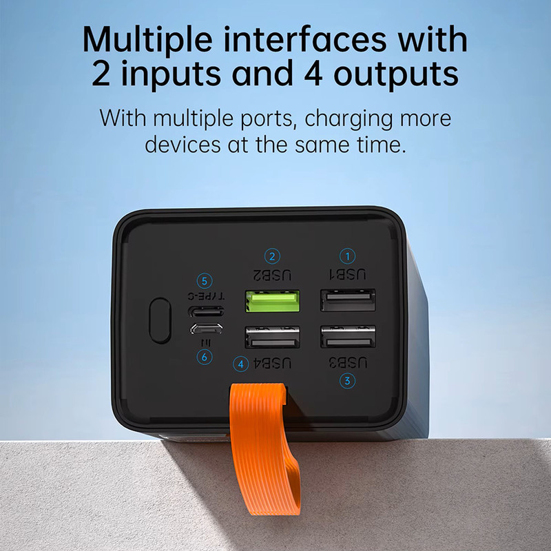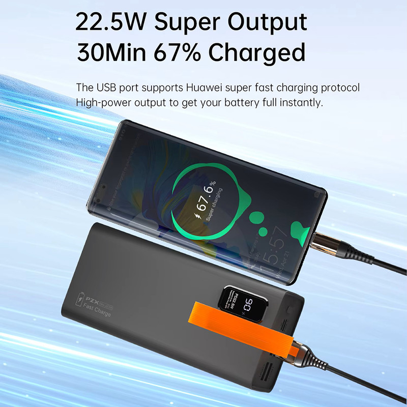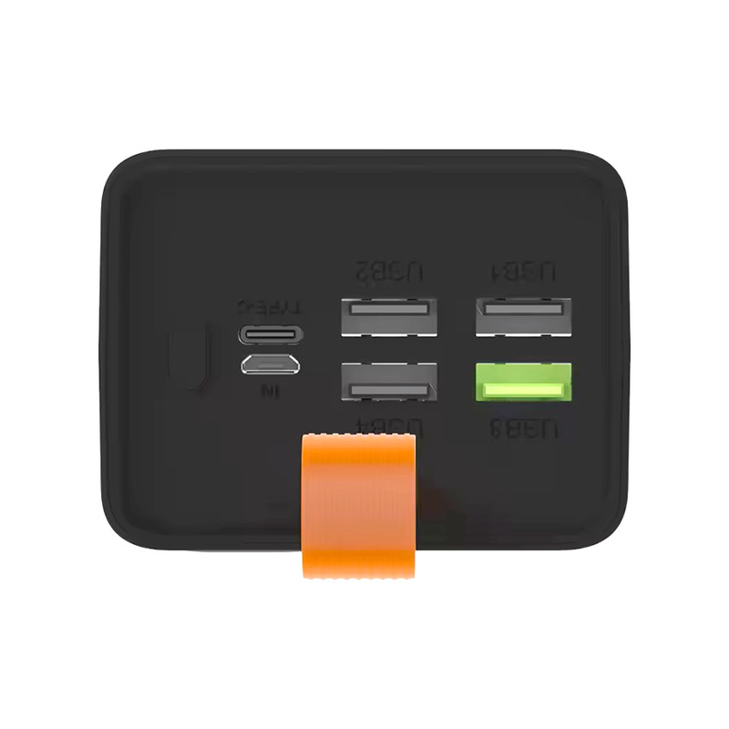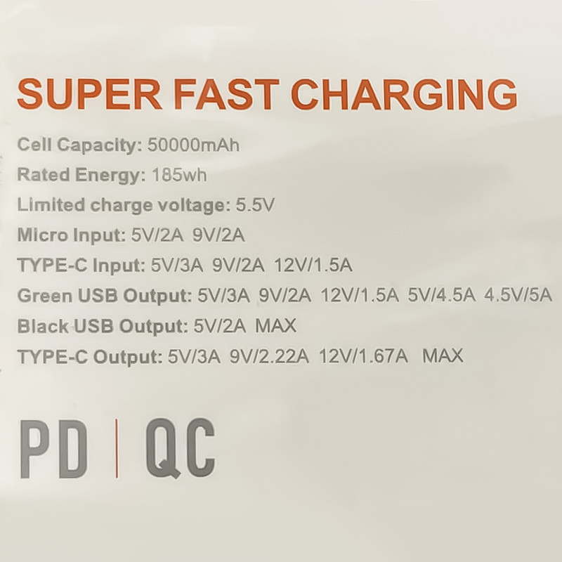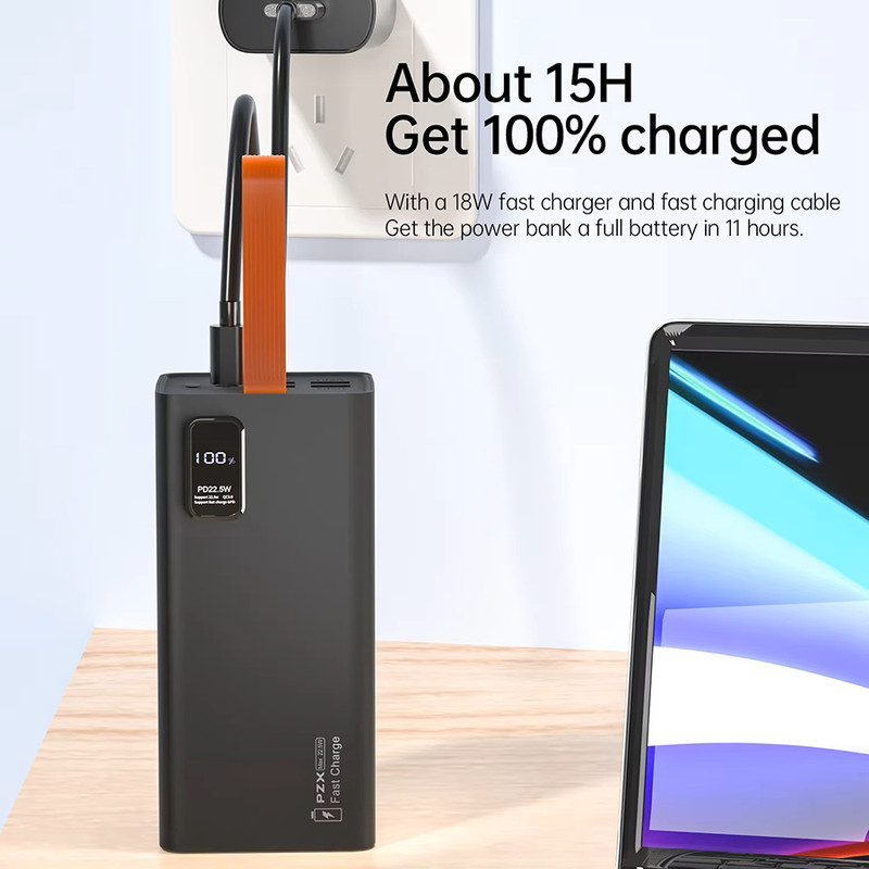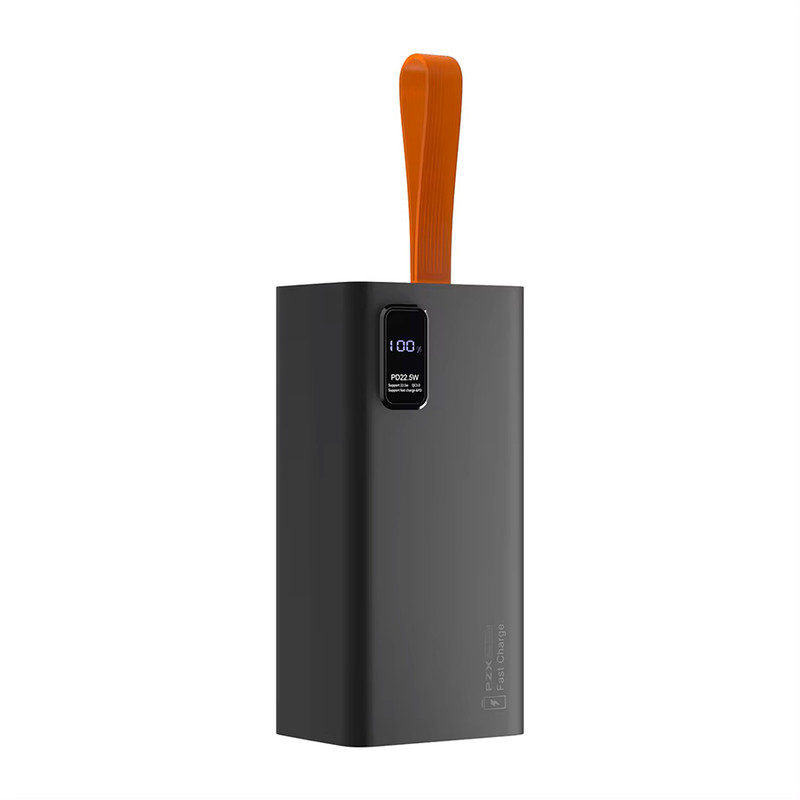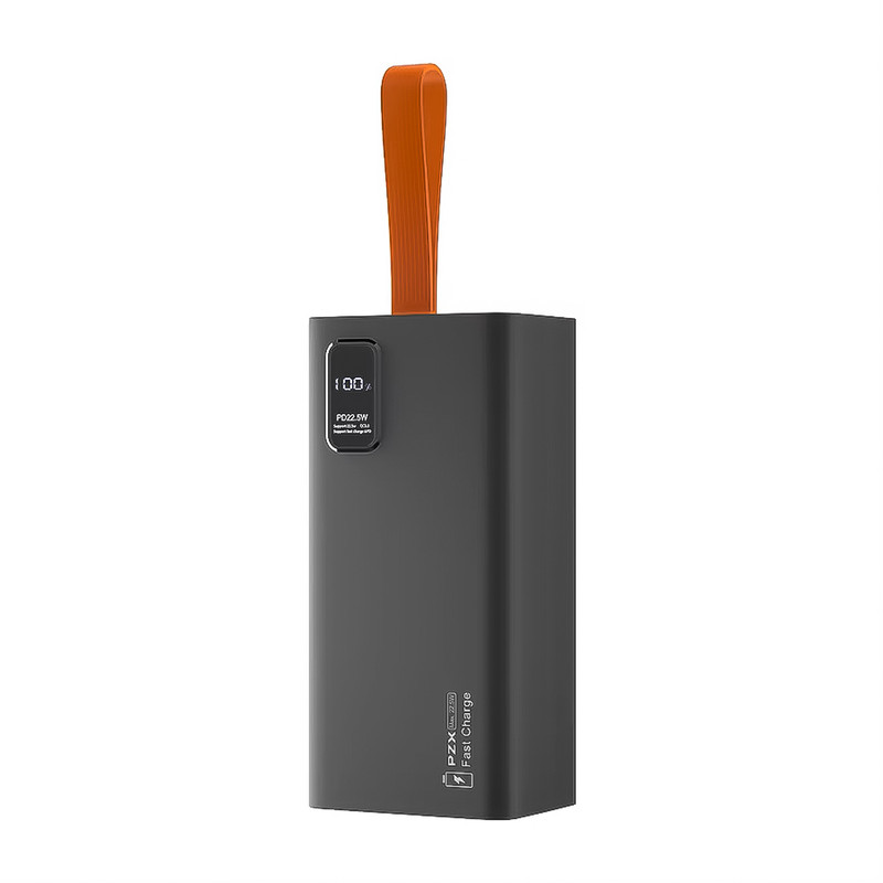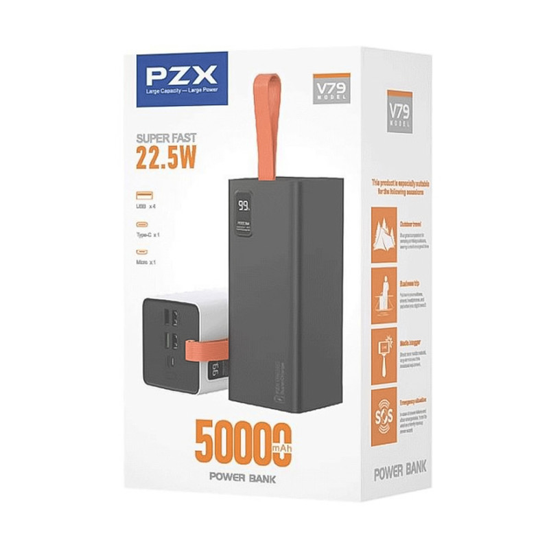 در نگاه اول پس از بازکردن جعبه، با پاوربانکی تقریبا سنگین و طراحی مینیمال مواجه خواهید شد. بند آویز سیلیکونی نارنجی رنگ مشخصا بیانگر این است که این محصول برای افرادیست که میخواهند مدت زیادی در کمپ یا سفر و کوه و بیابان بمانند. ظرفیت اسمی این هیولا پنجاه هزار میلیآمپر ساعت میباشد. قسمت بالای پاوربانک دارای چهار درگاه خروجی USB، یک درگاه ورودی میکرو یواسبی و یک درگاه تایپسی که هم ورودی و هم خروجی است. یک نمایشگر در جلوی پاوربانک میزان شارژ را به عدد و درصد نمایش میدهد. قابلیت سوپر فست شارژ و توان ۲۲.۵ وات (خروجی سبز رنگ یواسبی) مهمترین ویژگی پاوربانک مدل V79 از برند PZX میباشد. جمع بندی اینکه این پاوربانک به دلیل ظرفیت بالا بهدرد استفاده روزمره یا توی جیب قرار دادن نمیخورد. اما اگر چندین بار نیاز دارید که دستگاهتان را شارژ کنین و مدت زمان طولانی به برق دسترسی ندارید بهترین گزینه برای انتخاب برای شماست. اطلاعات دقیقتر و کاملتر را در عکسها قرار دادیم حتما به آنها نیز توجه فرمایید.