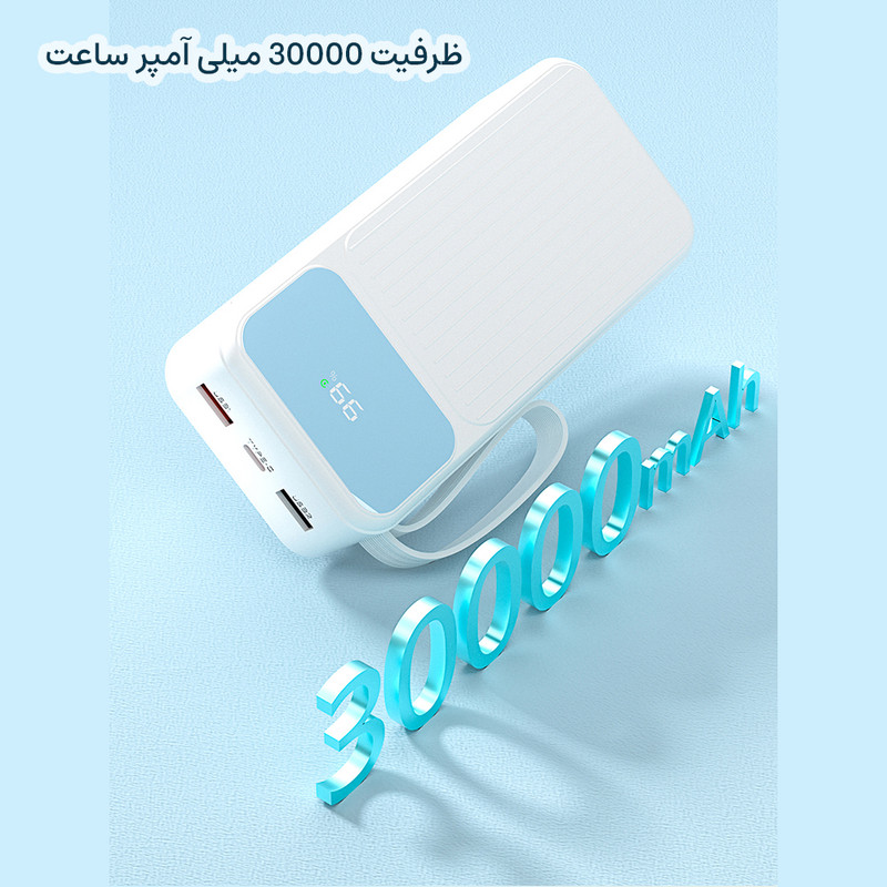 برند معتبر PZX - ظرفیت ۳۰ هزار میلی آمپر ساعت - پشتیبانی از شارژ سریع ۲۲.۵ وات - دارای 2 درگاه USB - دارای یک درگاه Type C - دارای دو عد کابل متصل (لایتنینگ و تایپ سی) - دارای بند آویز