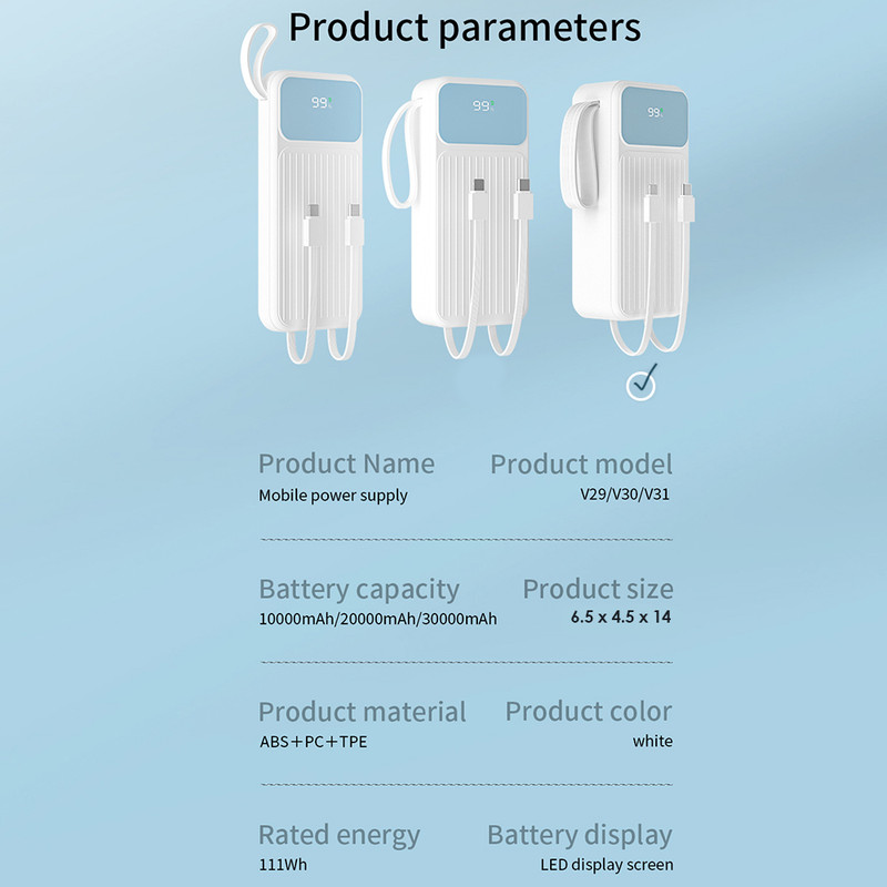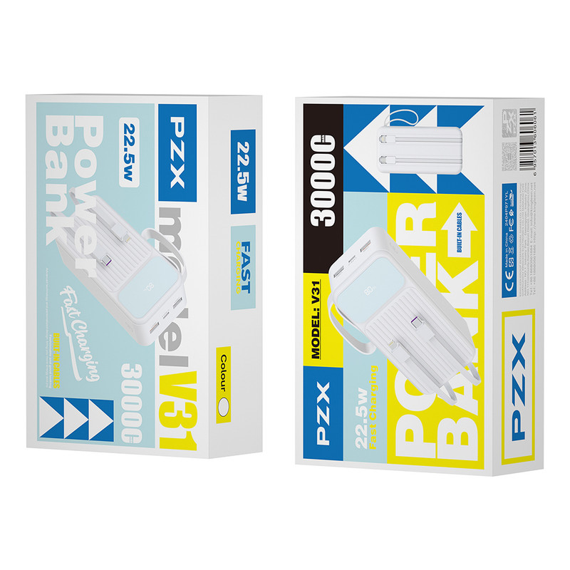 هیولایی از برند PZX با ظرفیت اسمی 30 هزار میلیآمپر ساعت و توان 22.5 وات مخصوص افرادیه که دایما تو سفر هستن. وزن تقریبا زیادی داره و مناسب استفاده روزمره نیست. بند آویز سیلیکونی حملش و بسیار راحتتر کرده. روی پاوربانک صفحهنمایش جهت نشان دادن میزان شارژ دستگاه به عدد و درصد مشاهده میشه. در بالای پاوربانک سه درگاه وجود داره : دوتا خروجی یواسبی که یکی معمولی و قرمز رنگ فست شارژه. درگاه وسط از نوع تایپ سی هستش که خوشبختانه هم ورودیه و هم خروجی. نکته مهم و قابلیت خوب این پاوربانک وجود تو کابل متصل در پشت دستگاهه و زمانهایی که کابل همراهتون نیست میتونین دستگاههایی که لایتنینگ و تایپسی رو پشتیبانی میکنن و شارژ کنین. جمعبندی داستان: اگه بهدنبال پاوربانک ظرفیت بالا و باکیفیت و البته فستشارژ هستین یکی از بهترین گزینهها تو رنج قیمتی خودش مدل V31 از برند خوشنام پیزدایکس هست.