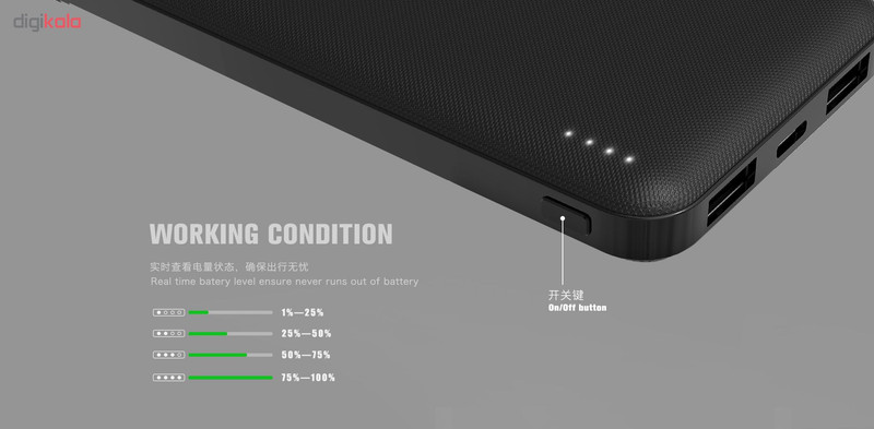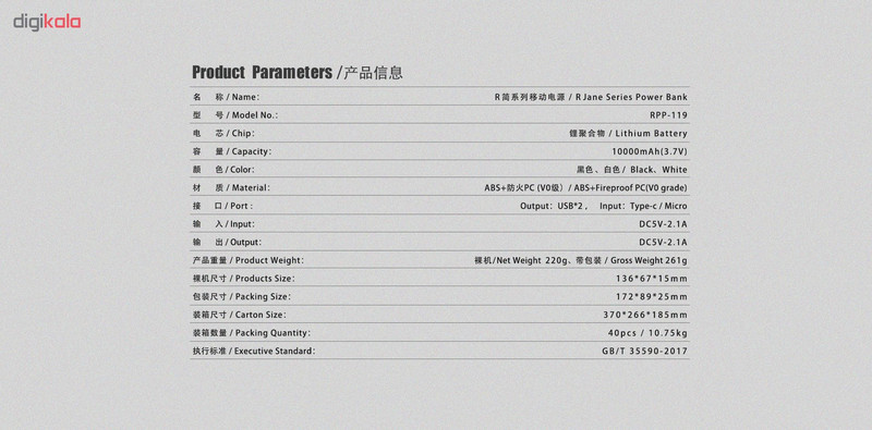 پاوربانک ریمکس مدل RPP-119 با ظرفیت 10000 میلی آمپر بر ساعت از جدید ترین محصولات شرکت ریمکس می باشد . از نکات مثبت آن می توان به وزن کم و ظریف بودن آن اشاره کرد . این پاوربانک دارای 2 درگاه خروجی می باشد که می توان همزمان 2 دستگاه را با آن شارژ کرد . همچنین دارای دو درگاه ورودی برای شارژ پاوربانک می باشد که میتوان از درگاه TYPE-C یا Micro USB برای شارژ پاوربانک استفاده کرد.