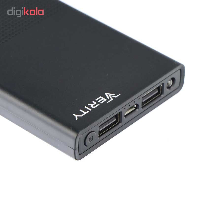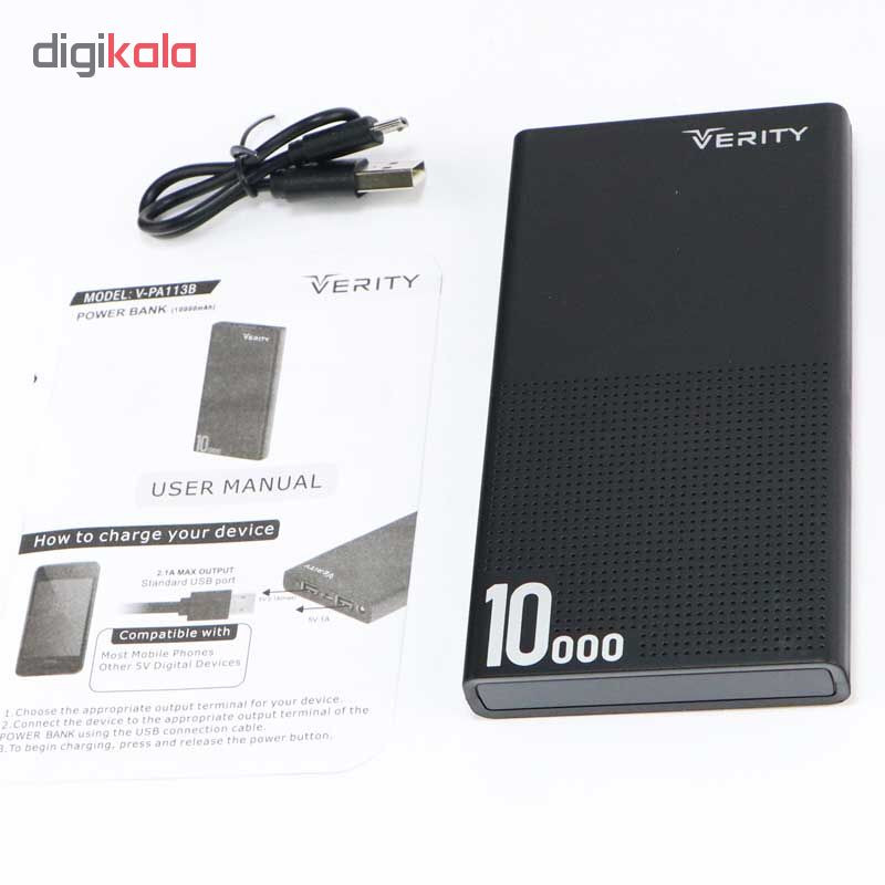 پاور بانک وریتی مدل V-PA113 دارای ظرفیت اسمی 10000 میلی آمپر بر ساعتی بوده و باتری آن از نوع لیتیوم پلیمری است که وزن آن را نسبت به شارژر همراه های دیگر که باتری لیتیوم یونی دارند سبک تر می کند. این پاور بانک دارای دو خروجی USB است که شدت جریان خروجی آن ها برابر با 2.1 آمپر و 1.0 آمپر است که در این رابطه باید به این نکته نیز اشاره کنیم که خروجی کلی آن هم برابر با 2.1 آمپر است. PA113 می توان از طریق درگاه ورودی میکرو یو اس بی که روی آن قرار داده شده است، شارژ کرد. شدت جریان ورودی کلی هم در آن معادل 2.0 آمپر است. در نظر داشته باشید که وریتی از گوشی شما در برابر شارژ بیش از حد محافظت کرده و از آن جلوگیری می کند.