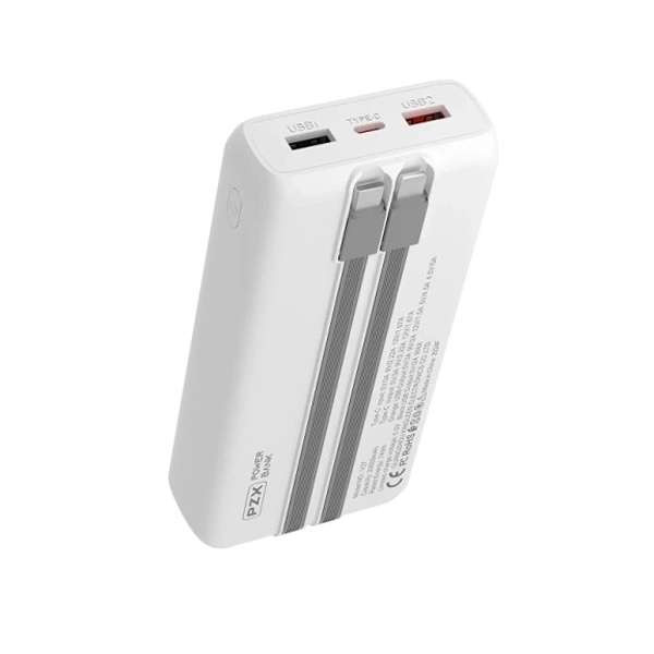 برند معتبر PZX - ظرفیت ۲۰هزار میلی آمپر ساعت - پشتیبانی از شارژ سریع ۲۲.۵ وات - فناوری شارژ PD - دارای ۲ درگاه USB - دارای یک درگاه Type C - دارای دو کابل متصل