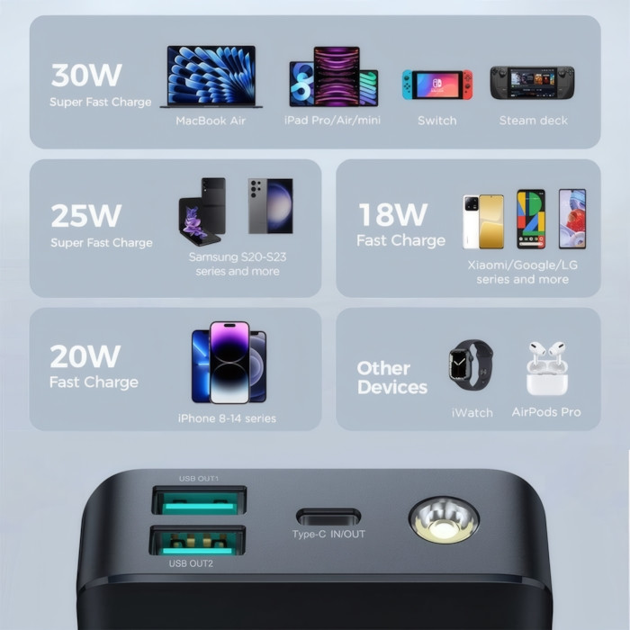 فناوری USB PD , تکنولوژی Quick Charge 3.0 , امکان شارژ کردن سریعتر موبایل (با شدتجریان 2.0 آمپر و بالاتر) , دارای چراغ قوه