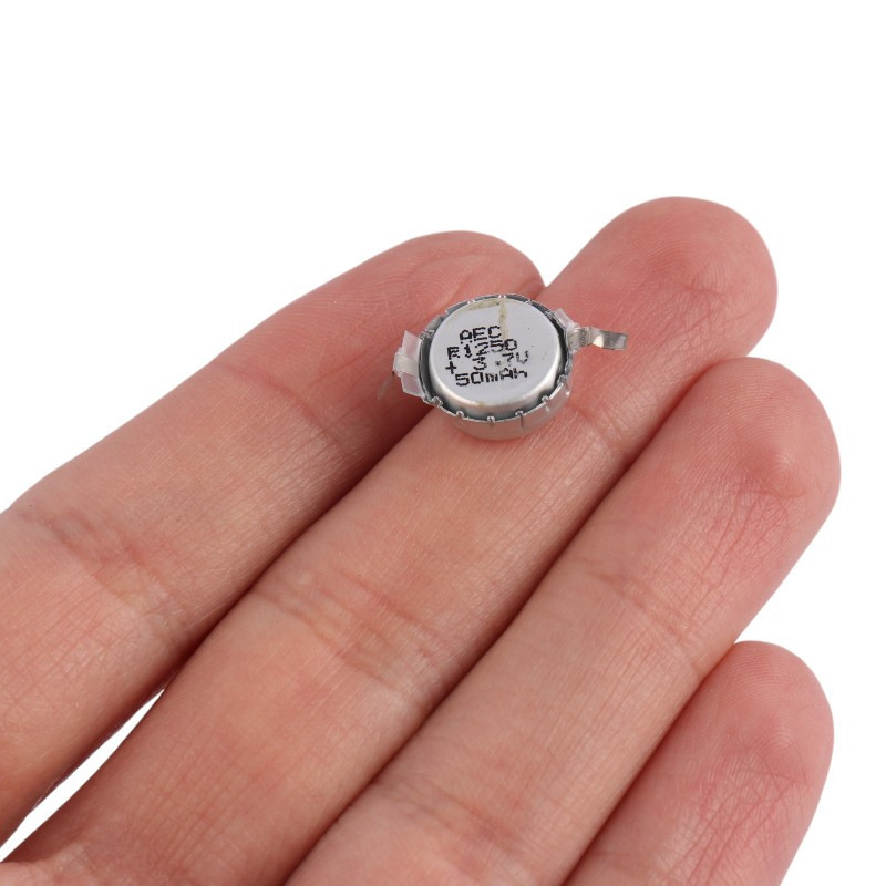 باتری لیتیومی سکه ای مدل R1250 با ظرفیت 50 میلی آمپر ساعت می باشد. این باتری مناسب برای هندزفری و ایرپاد میباشد .ظرفیت باتری 50 میلی آمپر ساعت، مدل باتری R1250 از نوع لیتیوم یونی شارژی در ولتاژ 3.7 ولت است.