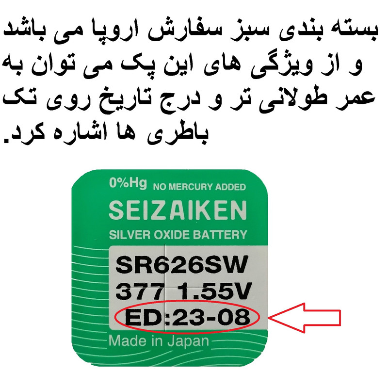 باتری سلولی دکمه ای اکسید نقره ای Seizaiken SR626SW 377 1.55v سازگار است با 626 ، Seiko: SR626 ، 377 وبا مشخصات خروجی: 1.55 ولت DC و کاربرد آن در دوربینها، ماشینحسابها، ساعتها، اسباببازیها، دستگاههای بهداشتی خانگی (نمایشگر گلوکز، کافهای فشار خون و دماسنجهای دیجیتالی گوش)، رایانهها، کتابهای صوتی، بازیها، اسباببازیها و موارد دیگر استفاده میشوند.