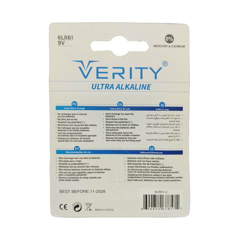 ولتاژ باتری9 ولتنوع تکنولوژی باتریآلکالاینقابلیتهای باتریماندگاری طولانیتعداد باتریهای موجود در پک۱ عددینوع باتریکتابی 9V