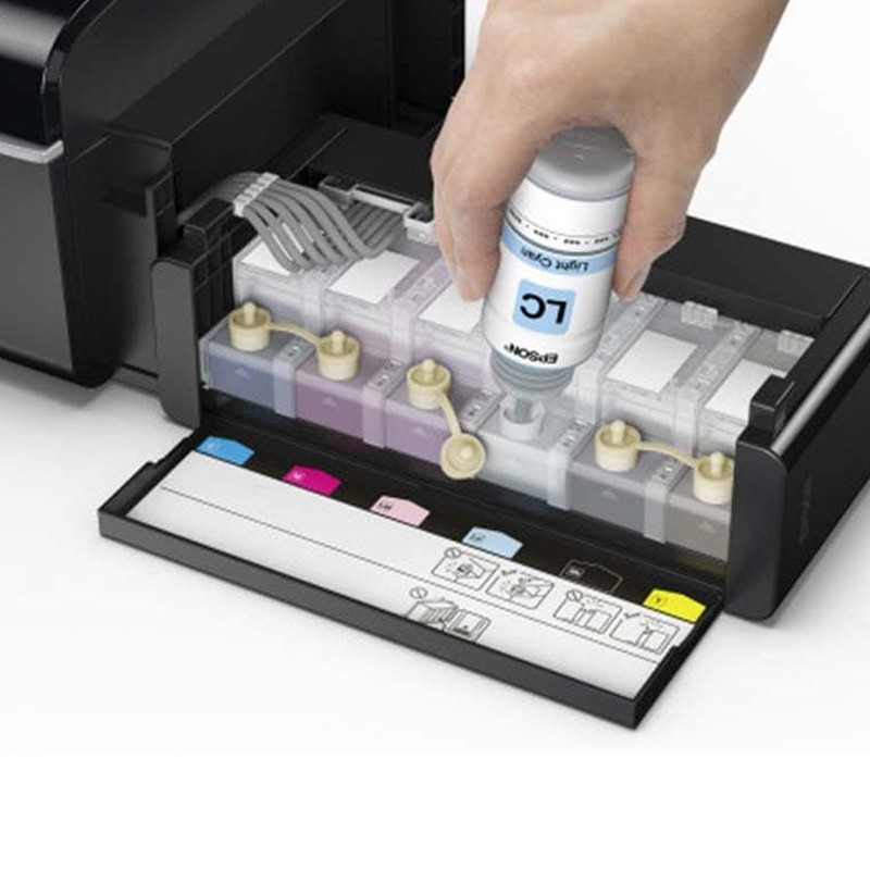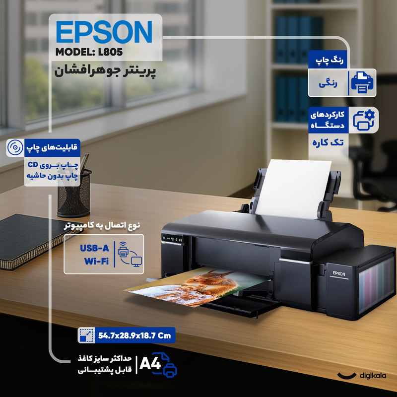 پرینترهای جوهرافشان یکی از دستگاههای لازم در ادارات و کاربردهای خانگی هستند و استفادههای گوناگونی از آنها میشود. پرینتر «L805» از شرکت «اپسون» (Epson) در ابعاد 187×289×547 میلیمتر و وزن 6 کیلوگرم عرضه میشود. چاپ به صورت جوهرافشان و رنگی در وضوح 5706×1440 dpi با استفاده از 90 نازل مشکی و 90 نازل رنگی انجام میشود. میتوانید 5 برگ در دقیقه را به صورت رنگی یا سیاه و سفید چاپ کنید. برای چاپ عکس در اندازهی 10×15، حدود 12 ثانیه زمان لازم است. این پرینتر از کاغذهایی با اندازههای A4، A5، A6، B5، C6 (Envelope)، DL (Envelope)، No 10 (Envelope)، 10×15، 13×18 و Legal پشتیبانی میکند؛ همچنین قابلیت چاپ روی «CD» را دارد. چاپ دورو به صورت دستی انجام میشود. ظرفیت سینی کاغذ 120 برگ کاغذ استاندارد و 20 برگ Photo Paper است. ظرفیت سینی خروجی 50 برگ است. چاپگر از طریق درگاه USB به یارانه وصل شده و با برق شهری تغذیه میشود. برق مصرفی دستگاه در حالت چاپ برابر با 13 وات و در حالت Sleep Mode برابر با 1.2 وات است. این چاپگر به مخزن جوهر مجهز است و میتوانید با استفاده از بستهی جوهر T6736، تانکر جوهر را پر کنید.