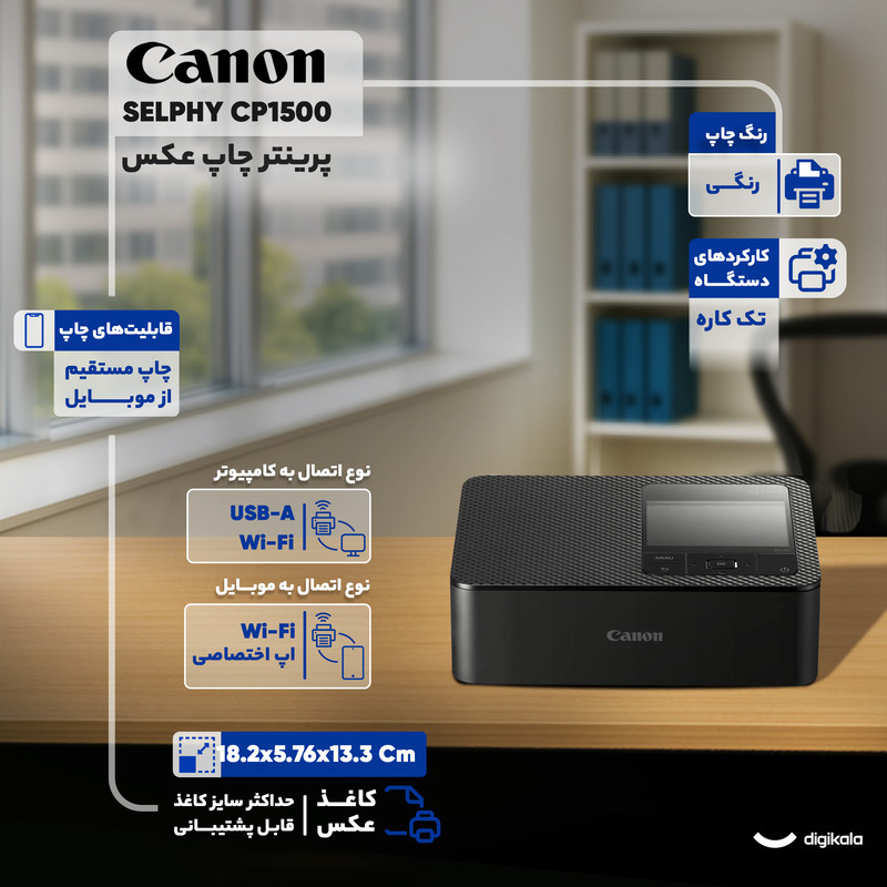 پرینتر چاپ عکس کانن مدل SELPHY CP1500 یک چاپگر جوهرافشان تککاره ویژه چاپ عکس با کیفیت بالا است که با فناوری سابلیمیشن و دقت ۳۰۰x۳۰۰ dpi، رنگها را با وضوح و پایداری خیرهکننده بازتولید میکند. این مدل قادر به چاپ ۱۶.۷ میلیون رنگ است و خروجیهایی مشابه چاپهای حرفهای عکاسی ارائه میدهد. بدنه جمعوجور با ابعاد ۱۸.۲x۵.۷۶x۱۳.۳ سانتیمتر و وزن تنها ۸۵۰ گرم، آن را به یک گزینه ایدهآل برای استفاده رومیزی یا حمل در سفر تبدیل کرده است. وضعیت دستگاه از طریق نمایشگر رنگی داخلی بهوضوح قابل مشاهده و کنترل است.