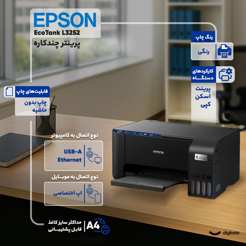 یکی از مزیتهای اصلی این مدل مخزن جوهر EcoTank با ظرفیت بالاست که کارکرد کارتریج مشکی تا ۳۶۰۰ برگ و رنگی تا ۶۵۰۰ برگ را ارائه میدهد، هزینه چاپ را به شکل محسوسی کاهش میدهد و برای حجم کار متوسط و زیاد مناسب است. با مصرف انرژی پایین و قابلیت حالت Sleep و Standby، Epson EcoTank L3252 ترکیبی از کیفیت، صرفهجویی و عملکرد پایدار برای کاربر مدرن فراهم میسازد.