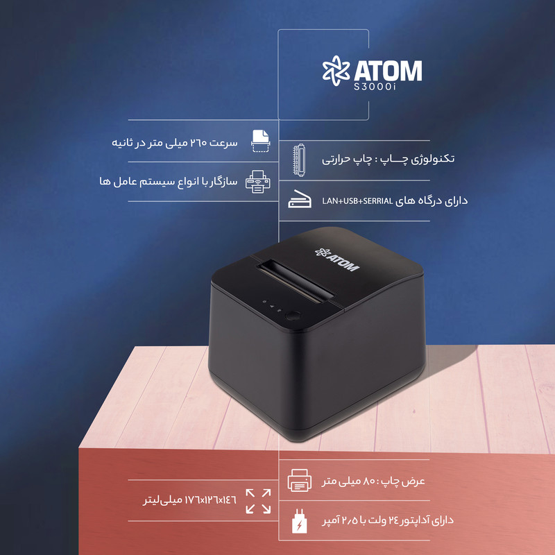 همیشه داشتن اطلاعات روی کاغذ یکی از بهترین راههای حفظ و جلوگیری از فراموشی آنها است. در بسیاری از مشاغل و کارها نیاز به پرینت کردن اطلاعات است. ولی این پرینت کردن روی ورقهای A4 یا A5 ممکن است پرهزینه یا غیرمنطقی باشد. برای این کار از پرینترهای حرارتی رولی استفاده میشود که صرفهجویی بالایی در مصرف کاغذ و هزینه و حتی جوهر پرینترها دارد. در بسیاری از رستورانها یا فروشگاهها حتما شاهد آنها بودهاید که لیست خرید و سفارش شما بههمراه قیمتها بهصورت چاپشده روی یک کاغذ بلند بهشما ارائه میشود. این کاغذها از پرینترهای حرارتی رول بیرون میآیند. پرینتر حرارتی اتم مدل S300i یکی از همان پرینترهایی است که میتواند مصرف کاغذهای A4 و A5 را پایین آورد و در هزینههای مختص کاغذ صرفهحویی شود. شما میتوانید برای تهیه فاکتور یا لیست در کسبوکار خود از این پرینتر استفاده کنید. پرینتر حرارتی اتم مدل S300i سیاهوسفید بوده و در عرض 80 میلیمتر روی کاغذ توانایی چاپ دارد. این فیش پرینتر فول پورت بوده و دارای درگاههای Serial+USB+Ethernet و درگاه اتصال به کشوی پول است و میتواند در شبکههای کامپیوتری و در فروشگاههای بزرگ که تمامی سیستمها بهصورت یکپارچه و شبکه هستند کارایی بالایی داشته باشد. این پرینتر سبک و جمعوجور بوده و فضای زیادی را اشغال نمیکند. منبع تغذیه این پرینتر حرارتی یک آداپتور 24 ولت با 2.5 آمپر است.