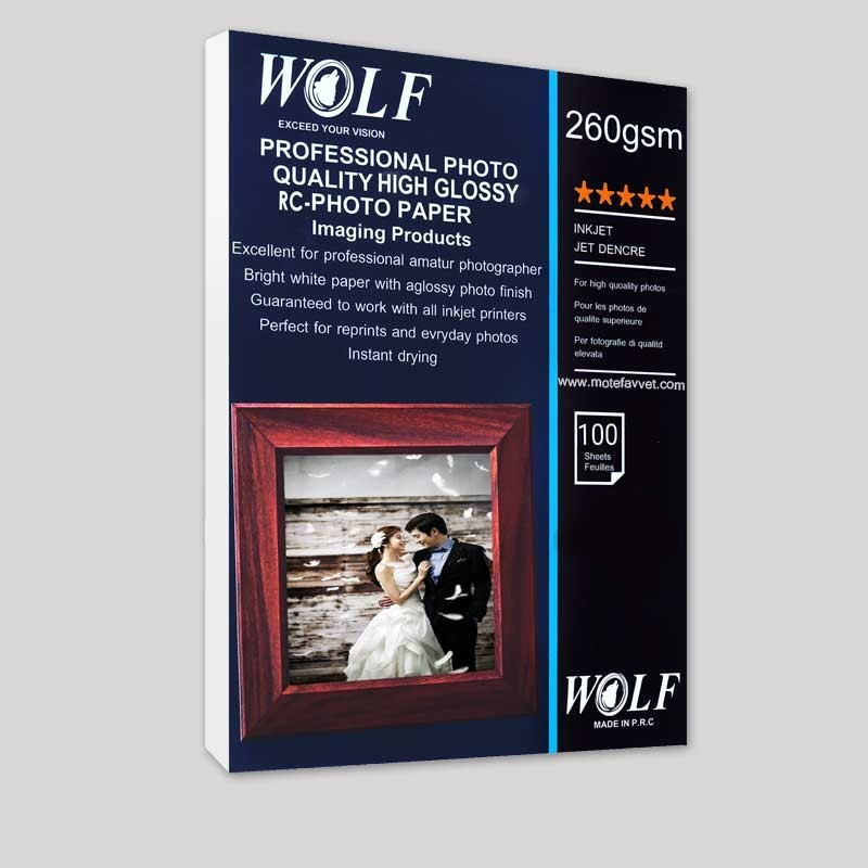 ویژگی دیگر کاغذ عکس فوق براق RC-13X18 WOLF، فوق براق بودن آن است. این کاغذ عکس بسیار براق هستند اما خاصیت آینه ای (انعکاس تصویر) نداشته و براحتی می تواند آنها را در مکان های پر نور داخل قاب گذاشت و یا روی دیوار و… نصب نمود. وزن و ضخامت این کاغذ طوری طراحی و ساخته شده تا به راحتی تا و یا شکسته نشوند. این مدل کاغذ 260 دارای وزن 260gsm می باشد. معمولاً این گرماژ برای مصارف چاپ عکس و پروشور ها بسیار کاربرد دارند. کاغذ فتو گلاسه 260 گرم ولف (WOLF) سایز 130x180 میلی متر (5R) در بسته بندی های 100 عددی ، قابل استفاده در دستگاه های جوهرافشان می باشد.