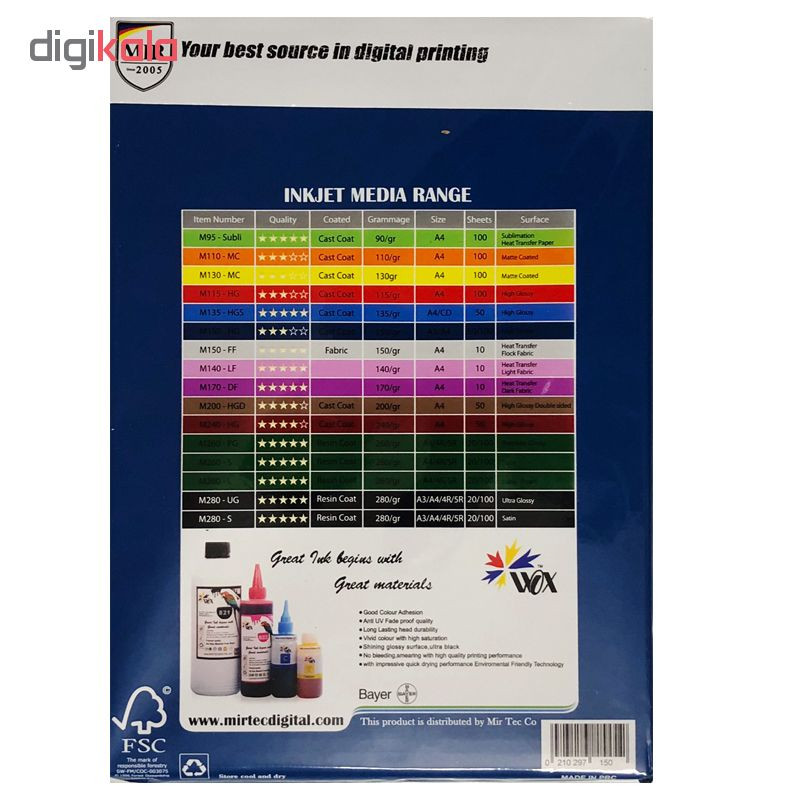 کاغذ پرینتر برند MIR مدل M150-HG یکی از محصولات عالی و مقرون به صرفه شرکت MIR میباشد . این کاغذ مخصوص تمامی پرینترهای جوهر افشان بوده و جنس آن گلاسه نیمه مات و براق است . اندازه A4 و وزن مناسب 150 گرمی کاغذ فراتر از حد تصور بوده و نزدیک به مقوا میباشد . این کاغذ توانایی چاپ با کیفیت 1440 DPI را داشته و بدلیل پوششی که روی کاغذ ایجاد شده ضد آب نیز میباشد . اگر دست شما خیس باشد و بصورت غیر عمد به کاغذ برخورد کند ، رنگهای روی کاغذ بهم نریخته و کیفیت آن حفظ میشود . این کاغذ برای کارهای حساس استفاده شده و سایه روشن ها را بخوبی و بدون ایجاد خط یا پله پله ایجاد میکند . شفافیت بالا حتی با جوهرهای قابل شارژ در ایران از خصوصیات این کاغذ بوده و شرکت MIR بر روی بسته بندی ، گارانتی بالاترین کیفیت کار با تمام پرینترهای جوهر افشان را نموده است . ضمنا" پوشش رو دارای INSTANT DRYING مواد خشک کن فوری میباشد که در لحظه قابل استفاده میباشد . قطعا" اگر بدنبال یک کاغذ ایده آل با تمامی خصوصیات بالا می گردید ، این انتخاب بسیار خوبی است .