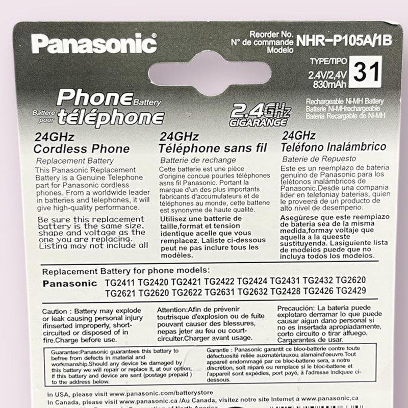 باتری تلفنهای بیسیم پاناسونیک مدل «HHR-P105A/1B» از نوع Ni-MH بوده و در ولتاژ 3.6 عمل میکنند. این باتری که در ابعاد 55 × 22 × 12 میلیمتر طراحیشده است 38 گرم وزن دارد و در تلفنهای بیسیم پاناسونیک مدلهای KX-TG2411،TG2420،TG2421،2422 استفاده میشود.