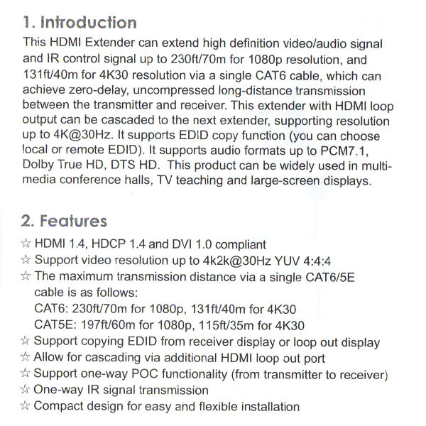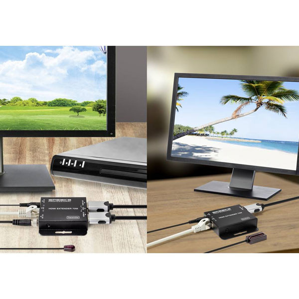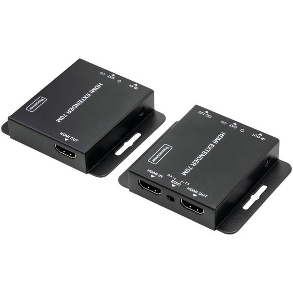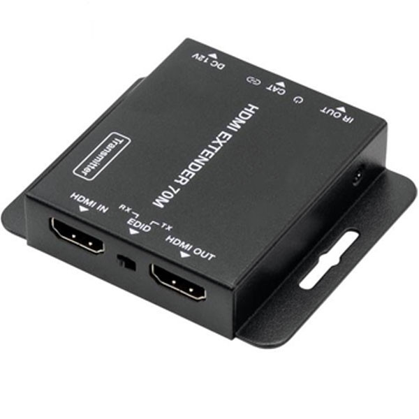 دستگاه افزایش طول 70 متری HDMI با یک کابل شبکه تصاویر را بدون نویز و به صورت FULL HD و با کیفیت بالا 1080P انتقال می دهد. لازم به ذکر است جنس کابل استفاده شده باید از نوع کابل CAT6-CAT5E تمام مس باشد.کارکرد دستگاه به این شکل هست که دستگاه فرستنده در مبدا با ورودی تصویر HDMI و آداپتور برق قرار می گیرد ، به طور مثال مبدا می تواند دستگاه DVR - نوت بوک - کامپیوتر - گیرنده دیجیتال - اندروید باکس باشد که تصویر داخلی رو از پورت HDMI خروجی می دهند و می توان با استفاده از کابل HDMI مرغوب اتصال بین دستگاه فرستنده برقرار کرد، نکته قابل ذکر در دستگاه Transmiter این هست که خروجی HDMI دوم برای نمایش همان تصویر ورودی اول هست به این معنی که خروجی کیس رو با کابل HDMI متصل کردین به دستگاه Transmiter و دیگه تصویر اون کیس رو ندارین شما در اون محل این قابلیت وجود داره در این دستگاه که از خروجی HDMI بعدی دوباره با کابل HDMI اتصال بدین به مانیتور و بتونید استفاده کنید و همزمان تصویر رو روی شبکه انتقال هم بدین.دستگاه گیرنده با خروجی پورت HDMI اتصال بین نمایشگر (تلویزیون - مانیتور - دیتا پروژکتور ) را برقرار می کند. فاصله بین دو دستگاه می تواند از طریق کابل شبکه مرغوب 70 متری پشتیبانی کند .