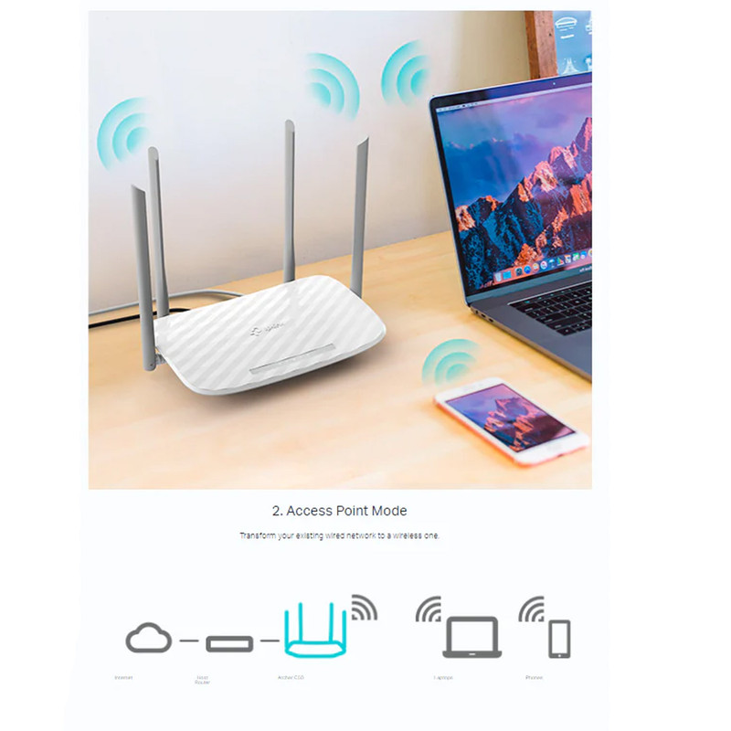 اکسس پوینت بیسیم دوبانده وای فای AC1200 تی پی لینک مدل Archer c50 یک محصول کاربردی و ایمن با 4 انتن و دو باند فرکانسی 2.4GHz - 5GHz و 4 پورت LAN است که بعنوان خروجی برای مصرف کننده ها و یک پورت WAN به عنوان ورودی کابل شبکه اینترنت مورد استفاده می باشد.این محصول به سفارش اروپا می باشد و در یک سری از امکانات با همین محصول ولی سفارش های امارات و آسیا متفاوت است. این محصول فقط قابلیت access point را برای شما به ارمغان بیارود. به کمک این قابلیت در این دستگاه میتوانید اینترنت دریافتی توسط کابل اترنت که از مودم سیمی یا بیسیم شما به پورت WAN یا internet port این محصول وصل میگردد را به صورت بیسیم در فضا منتشر کنید و اینترنت بیسیم داشته باشید و لی با کلی امکانات امنیتی بیشتر. نکته ای که باید توجه کرد این است که این محصول مودم ADSL نیست و ورودی خط تلفن ندارد. این دستگاه از تکنولوژی MU-MIMO بهره میبرد .سازگاری این روتر با استانداردهای IEEE 802.11b/g/n, 802.3/3u/3x، سرعتی برابر با 867+300 مگابیت در ثانیه را به کاربران ارائه میدهد. با این دستگاه دو باند در یک دستگاه دارید.از باند 2.4 گیگاهرتز برای کارهای روزمره استفاده کنید، در حالی که باند پرسرعت 5 گیگاهرتز را برای پخش ویدیوی HD، بازی های آنلاین و انتقال فایل های بزرگ آزاد بگذارید. دستگاههایی که از باند پرسرعت 5 گیگاهرتز استفاده میکنند، تداخل و تراکم کمتری وجود دارد و عملکرد بهتر و تجربه بیسیم بدون تاخیری را به شما میدهد. تکنولوژی MU-MIMO (multi-user, multiple input, multiple output) در واقع به روشی اشاره میکنه که در اون پهنای باند توسط روتر تجزیه و به دستگاههای جداگانه ارسال میشه. MU-MIMO سرعت اینترنت وای فای شما رو زیاد نمیکنه؛ بلکه این اطمینان رو به شما میده که موقع اتصال همزمان چند دستگاه به شبکه، سرعت ارتباط شما کاهش پیدا نمیکنه. MU-MIMO امنیت اتصال رو بالا میبره. با توجه به اینکه این تکنولوژی دیتا رو قبل از ارسال در هم میریزه و فقط دستگاههایی که مشخص شدن میتونن این اطلاعات رو دریافت و مرتب کنن، MU-MIMO درنهایت موجب بالا رفتن امنیت میشه.