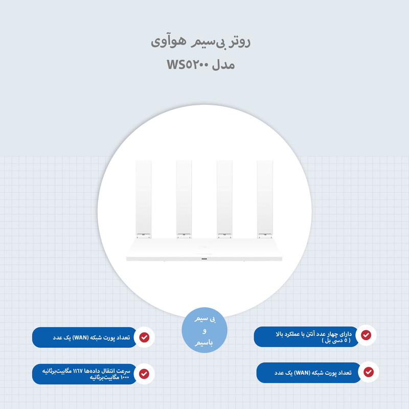 روتر WS5200 شرکت هوآوی یک روتر و اکسس پوینت مناسب فضاهای کوچک و متوسط است که امکان اشتراک گذاری اینترنت را در بستر وایفای ارائه میکند. WS5200 دارای 4 آنتن خارجی با قدرت پنج دسیبل است که قادر است محدوده وسیعی را پوشش دهد. این تعریف بهاینمعنا است که شما میتوانید از این روتر کوچک ولی قدرتمند در فضای شرکتها، سازمانها، ادارات، مدارس و خانهها استفادههای بهینهای داشته باشید. همچنین WS5200 تا سرعت انتقال 1167 و 1000 مگابیتبرثانیه را ارائه میدهد. WS5200 از استانداردهای شبکه WPA و WPA2 پشتیبانی میکند تا بستری امن و محافظت شده در اختیار شما فراهم کند. روتر هواوی WS5200 منطبق بر استاندارد AC1200 است و با داشتن یک باند بیسیم 5 گیگاهرتزی و یک باند 2.5 گیگاهرتزی، مجموع پهنای باند بیسیم آن به 1167 مگابیت در ثانیه میرسد. این روتر به طور هوشمند دستگاههای متصل را به سریعترین باند قابل پشتیبانی توسط آنها وصل میکند تا از بالاترین پهنای باند ممکن برخوردار شوند. وجود استاندارد AC1200 تضمین بخش ارائه پهنای باند بالا با وجود متصل بودن چندین کاربر به روتر است. گفتنی است که همچنین این روتر دارای فناوری تصحیح خطای LDPC است تا در مواقعی که سیگنال شبکه بیسیم ضعیف است، از بروز خطا پیشگیری کند و هنوز کاربر قادر به استفاده از شبکه باشد. باید به این مهم هم اشاره داشته باشیم که وجود چهار آنتن قوی با چیدمان دقیق و فناوری LDPC بر روتر هواوی مدل WS5200 تضمینبخش دریافت سیگنال قوی با وجود دیوار بر سر راه سیگنالها است و موجب کاهش اختلالات ناشی از وجود موانع میشود. در صورتی هم که کاربر به ارتباط کابلی پرسرعت نیاز داشته باشد، مودم هواوی مدل WS5200 دارای چهار درگاه شبکه گیگابیتی با توانایی ارائه پهنای باند تا 1000 مگابیتدرثانیه است. کلیه درگاههای اترنت این روتر گیگابیتی (GE) هستند.