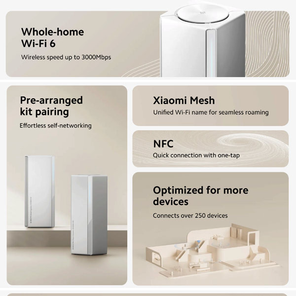 روتر و تقویت کننده بیسیم شیائومی مدل Xiaomi Mesh System AX3000 NE (1-pack) RD28 از نظر طراحی ظاهری به صورت مکعب مستطیل عمودی و به دو رنگ سفید و مشکی ساخته شده است.این وسیله کاربردی دارای رسانایی گرما و اتلاف گرمای عالی است. همچنین این روتر بی سیم همرفت کانال بزرگ و سینک های حرارتی بزرگی دارد که به طور موثر دمای تراشه را کاهش می دهد. این ویژگی سیستم را همیشه در حالت عملیاتی پایدار نگه می دارد.روتر شیائومی AX3000 از نسل جدیدی از فناوری Wi-Fi 6 بهره می برد. این فناوری امکان استفاده از سیستم را با سرعت بی سیم دو باند همزمان تا 2976 مگابیت در ثانیه فراهم میسازد. لازم به ذکر است که این سرعت 155 درصد بیشتر از سرعت روتر معمولی AX1800 است.