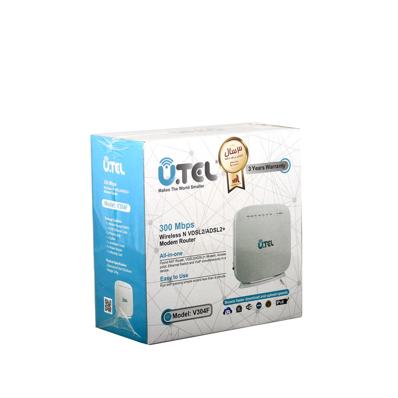 مودم روتر V304F محصول 100%ایرانی از برند یوتل است.این مودم ارائه سرویسهای سه گانه Video+Data+Voice را با بهرهگیری از استانداردهای VDSL2 و پروتکل SIP فراهم میکند. این دستگاه ارائه اینترنت پرسرعت با سرعت 100مگابیتبرثانیه و انتقال صوت با استفاده از پورت تلفن FXS را برای شما میسر میسازد. مودم روتر V304F New دارای 4 پورت LAN، یک پورت RJ-11 و یک پورت FXS است. این مودم از طریق رابط کاربری تحتوب، امکان تنظیمات پیشرفته مودم و ارتباطی امن را به مشترک میدهد و با دارا بودن آنتن داخلی سرعت 300 مگابیتبرثانیه در ارتباطات بیسیم را فراهم میسازد. یکی از امکاناتی که در این مودم از آن بهره میبرید امکان forward کردن پورتهای دلخواه روی IPهای شبکه داخلی و اتصال به آن پورتها از طریق IP Static است.