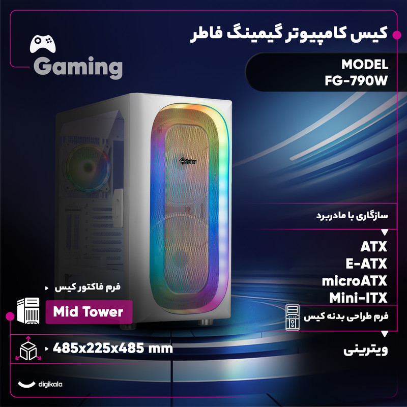 کیس کامپیوتر گیمینگ فاطر مدل FG-790W یک Mid Tower با طراحی ویترینی و پنل شیشهای یک طرفه است که جلوهای مدرن و جذاب به سیستم میبخشد. بدنه ترکیبی از فلز و شیشه است و با ابعاد ۴۸۵x۲۲۵x۴۸۵ میلیمتر فضای کافی برای نصب مادربردهای ATX، E-ATX، microATX و Mini-ITX ایجاد میکند. محل نصب پاور در پایین-پشت قرار دارد و امکان استفاده از پاورهای تا طول ۲۴۰ میلیمتر را فراهم میکند.