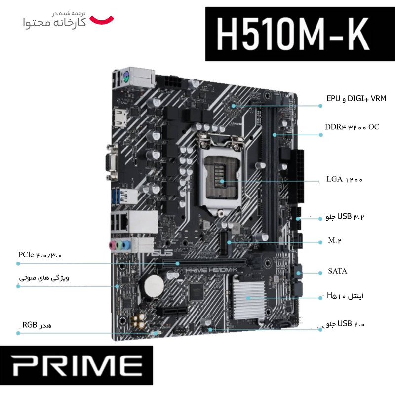 مادربرد PRIME H510M-K ایسوس یکی از انتخابها برای کسانی است که خواهان پردازنده های نسل دهم و یازدهم اینتل برای مصارف روزمره هستند. این مادربرد با دارا بودن درگاههای ارتباطی متعدد، ابعاد کوچک، پشتیبانی از حافظههای DDR4 تا سرعت 3200 مگاهرتز رم، درایو پرسرعت M.2، فن برای مدیریت سیستم خنککننده، یکی از قابلاعتمادترین مادربردهایی است که در همه سناریوهای روزمره قابل استفاده خواهد بود. این مادربرد تمامی نیازها را برآورده خواهد کرد. شرکت ایسوس از چیپست Intel H510 برای این محصول بهره برده است. سوکت پردازنده تعبیه شده برای این مادربرد LGA1200 شرکت اینتل است. این موضوع باعث شده که مادربرد PRIME H510M-K جزء مادربردهای مبتنی بر اینتل باشد. شرکت اینتل برای این محصول خود از دو اسلات رم DDR4 بهره برده است و میتواند تا 64 گیگابایت حافظه رم را پشتیبانی کند. فرم فاکتور این مادربرد از نوع microATX بوده که بهراحتی میتواند توسط بسیاری از کیسها پشتیبانی شود.