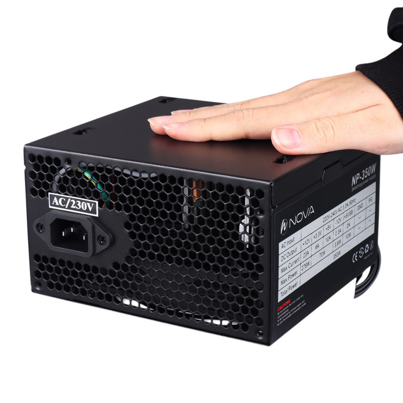 منبع تغذیه NP- 350 برند نوا از نوع غیر ماژولار بر اساس فرم فاکتور ATX طراحی شده است که برای انواع سیستم ها با مادربردهای اندازه استاندارد مناسب می باشد. این منبع تغذیه با بهره بردن از متریال و قطعات با کیفیت و استانداردهای حفاظتی OVP ،OPP و UVP، امنیت قطعات داخلی سیستم را تامین می کند. اتصالات این منبع تغذیه شامل دو عدد کانکتور IDE، سه عدد کانکتور SATA، یک عدد کانکتور 8 پین، یک عدد کانکتور 6 پین و یک عدد کانکتور 4+20 پین مادربرد می باشد. یک فن 120 میلی متری نیز بر روی این منبع تغذیه تعبیه شده که فرآیند خنک سازی و متعادل سازی دما را به خوبی اجرا نموده و از آسیب ناشی از فشار بار اضافی و گرمای بیش از حد به قطعات داخلی جلوگیری می کند.فن بدون صدا,توان خروجی 350 وات واقعی از دیگر مزایای این کالا میباشد