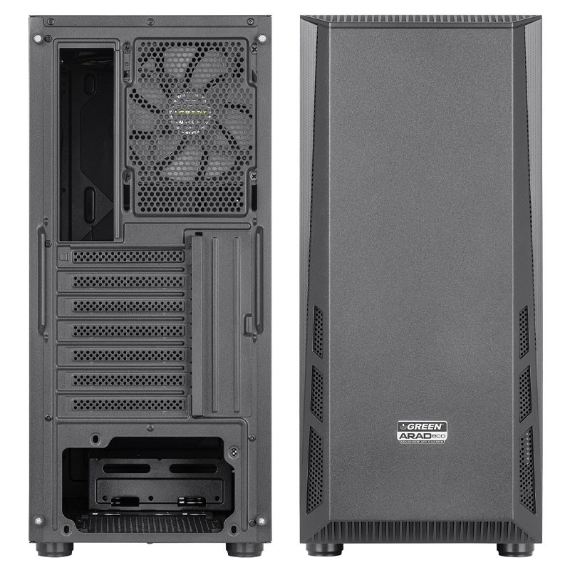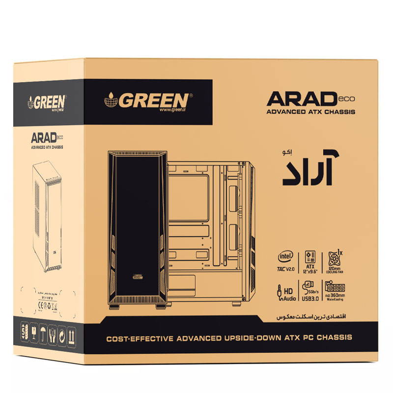 کاور کناری فلزی با قابلیت نصب دو عدد فن 120mm، پنل و بدنه فوق العاده شیک و در عین حال مستحکم، فن 120mm فوق العاده با دوام و کم صدا، پایه های ضد لغزش و پتانسیل قابل قبول در خنک سازی قطعات در کنار پشتیبانی از اغلب سخت افزارهای مدرن و رده بالای حال حاضر موجود در بازار، از مهم ترین ویژگی های کیس فوق العاده مقرون به صرفه و در عین حال مدرن آراد اکو (ARAD eco) گرین محسوب می شوند.